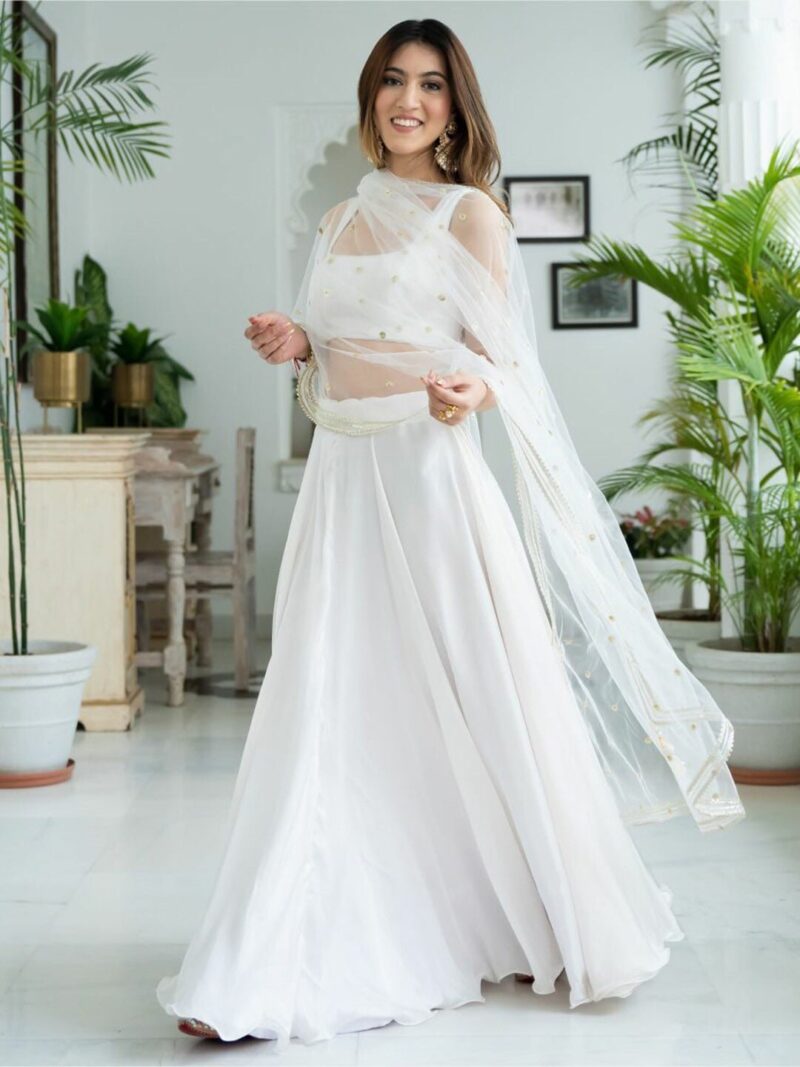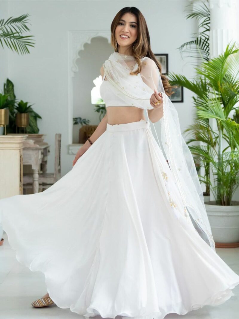 White solid ready to wear lehenga, has drawstring closure, flared hem