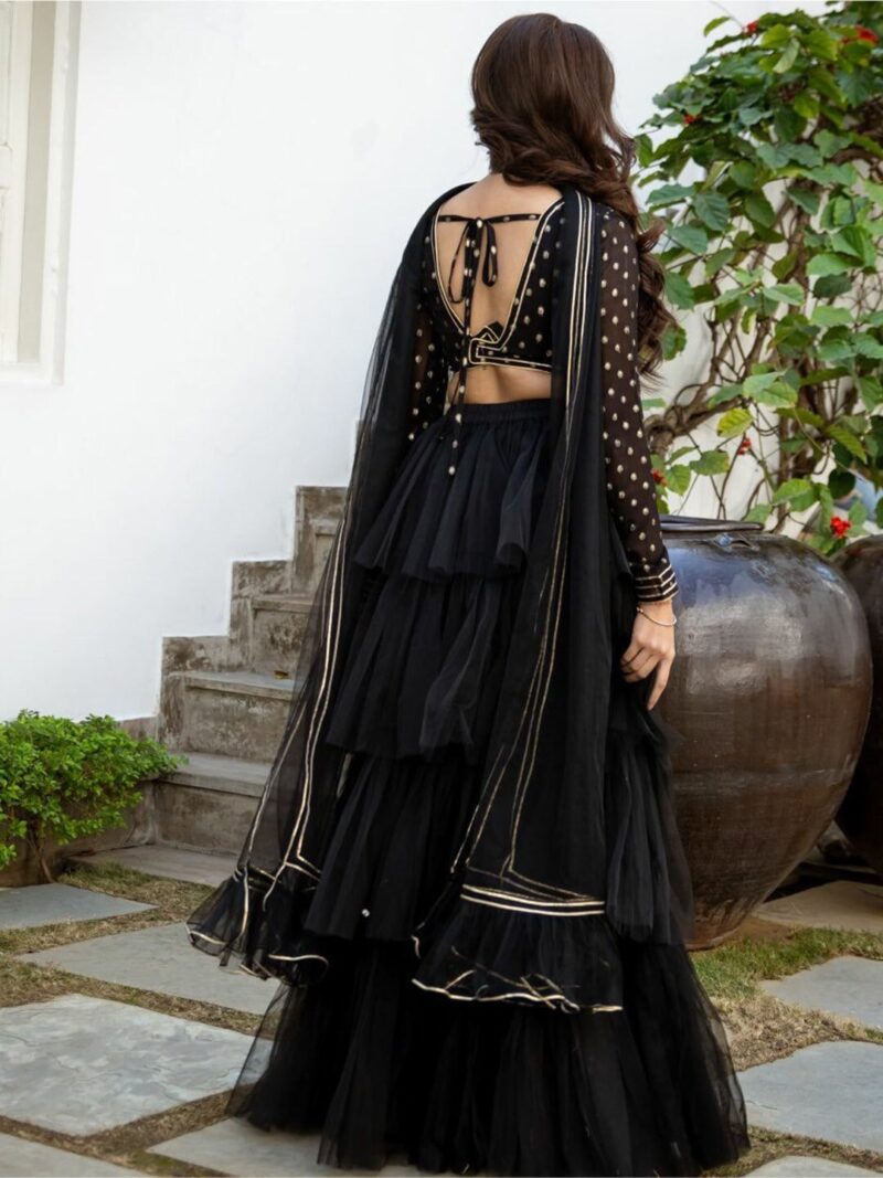 Black and gold-toned embroidered lehenga choli with dupatta,