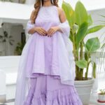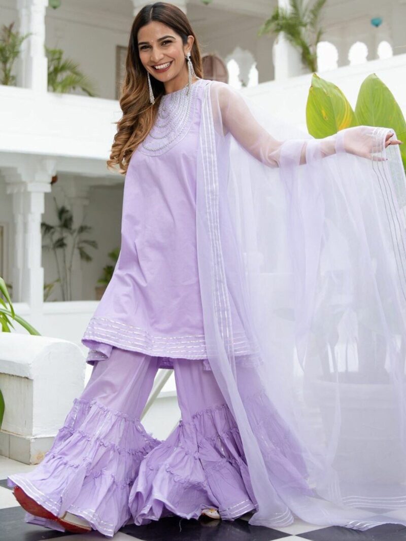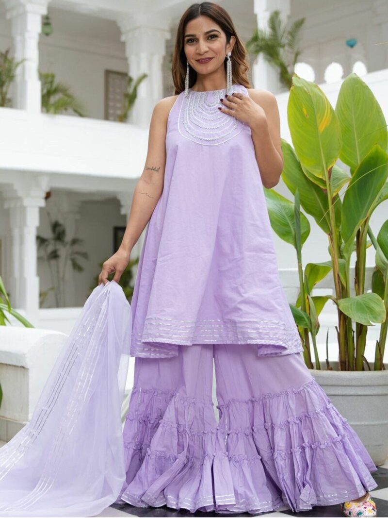 Lavanya The Label Women Lavender Embroidered Pure Cotton Kurta With Palazzos & Dupatta