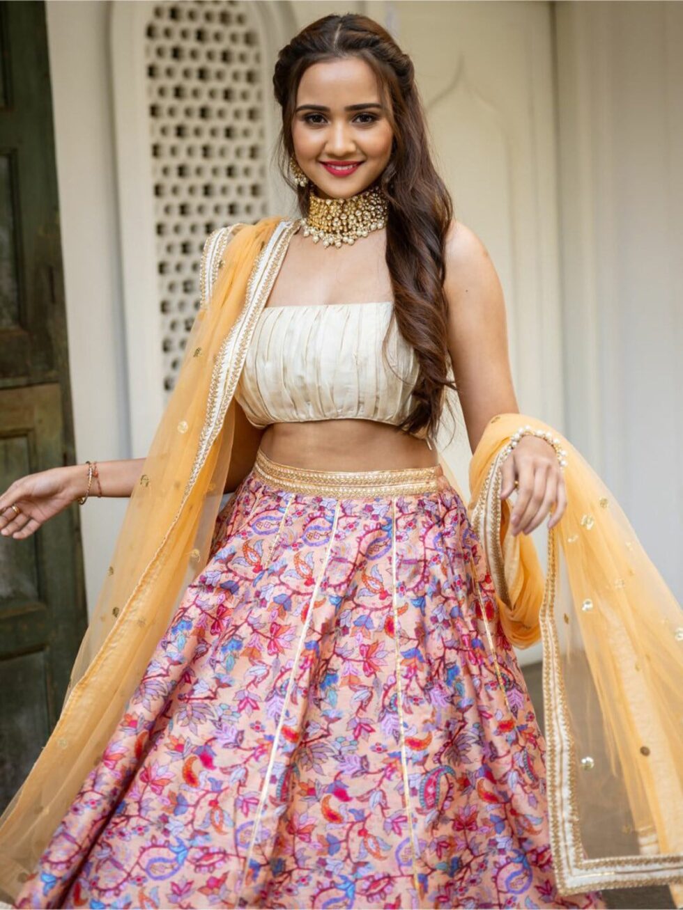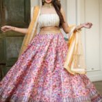 Purple and pink solid lehenga choli with dupatta, Purple and pink solid ready to wear blouse has a scoop neck sleeveless zip closure Purple and pink printed ready to wear lehenga has zip closure flared hem Purple and pink solid dupatta, border