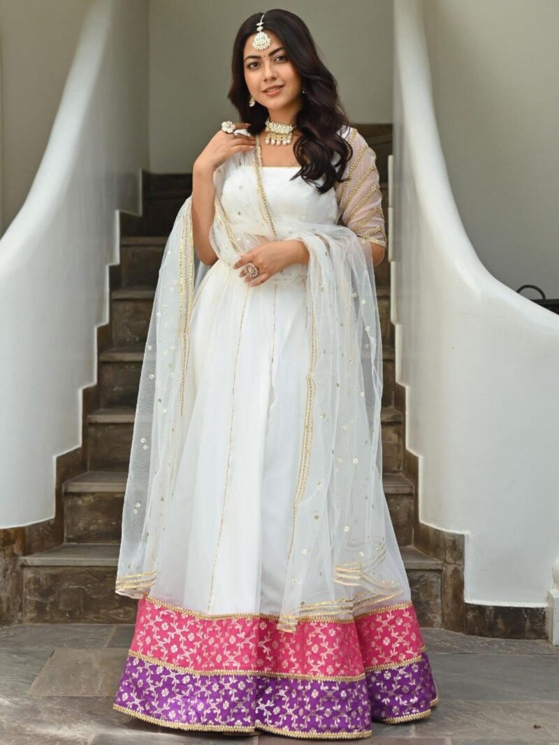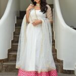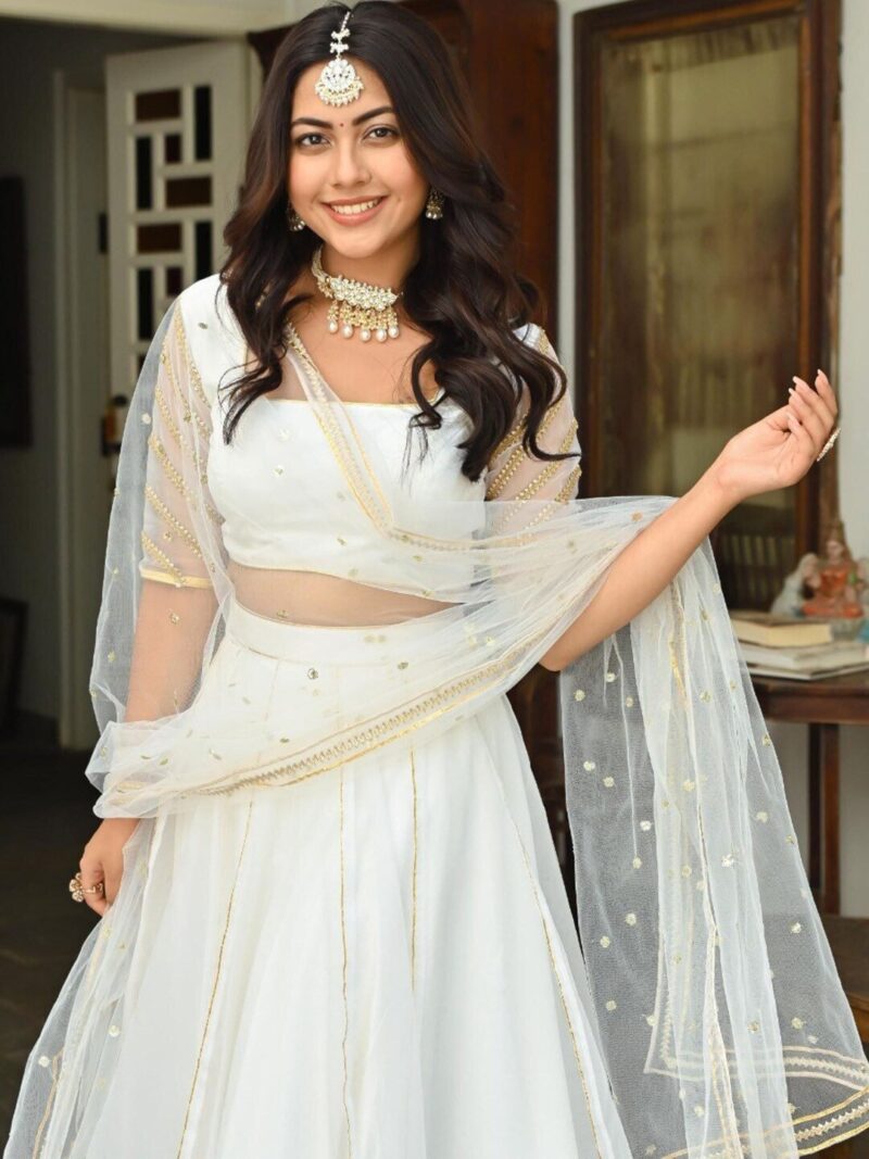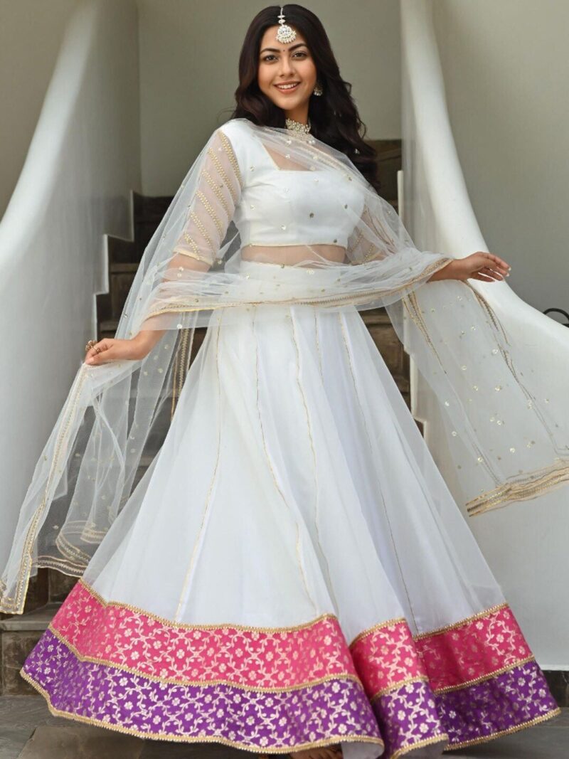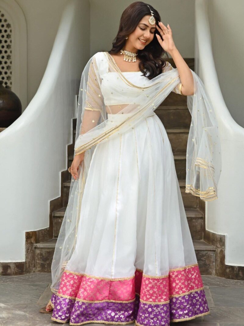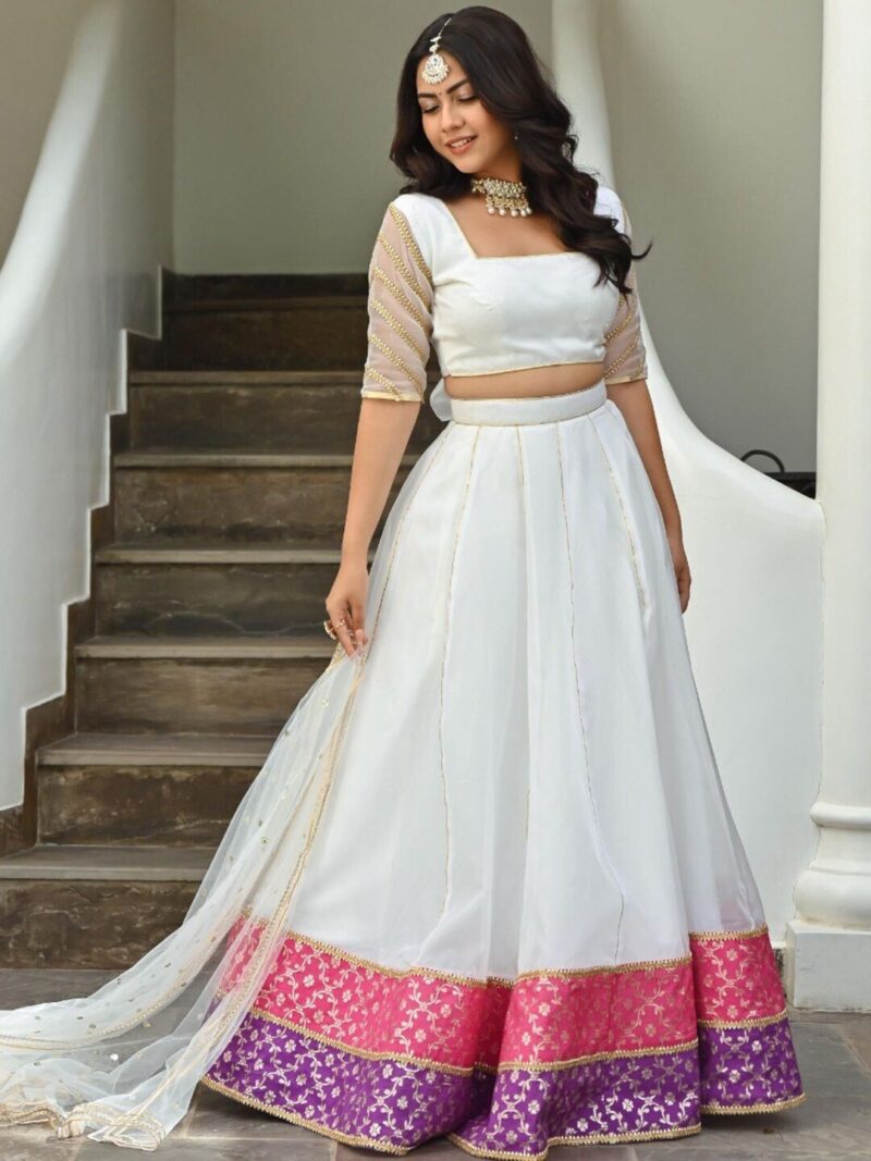White and pink solid ready to wear blouse, has a square neck, short sleeves, white and pink solid ready to wear lehenga, has zip closure, flared hem