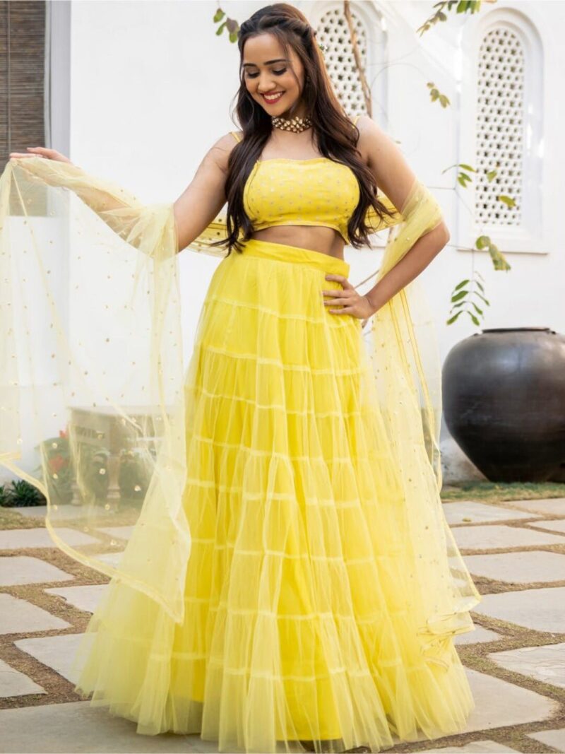 Yellow embroidered ready to wear blouse, sleeveless, yellow embellished ready to wear lehenga, has zip closure, flared hem
