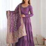 The Banarasi jacquard dupatta with weaving work adds a touch of tradition and sophistication to the outfit. Crafted from high-quality Chanderi silk, this purple anarkali suit is fully stitched and available in sizes XS to XXL for a perfect fit.
