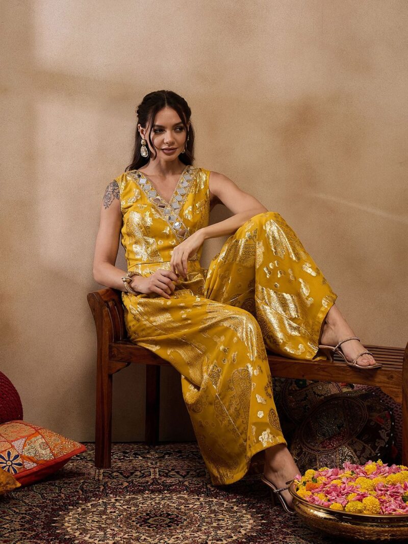 Yellow self design basic jumpsuit with embellished ,has a v-neck, sleeveless, na pockets