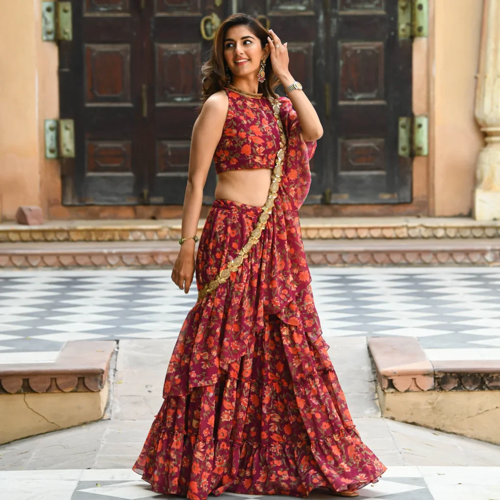 Elevate your style with this stunning Maroon Floral Print Saree. Made of soft georgette fabric, this saree is easy-to-carry and perfect to add some glam to any event. The trendy and playful frills on the border add a touch of femininity to this trendy piece.