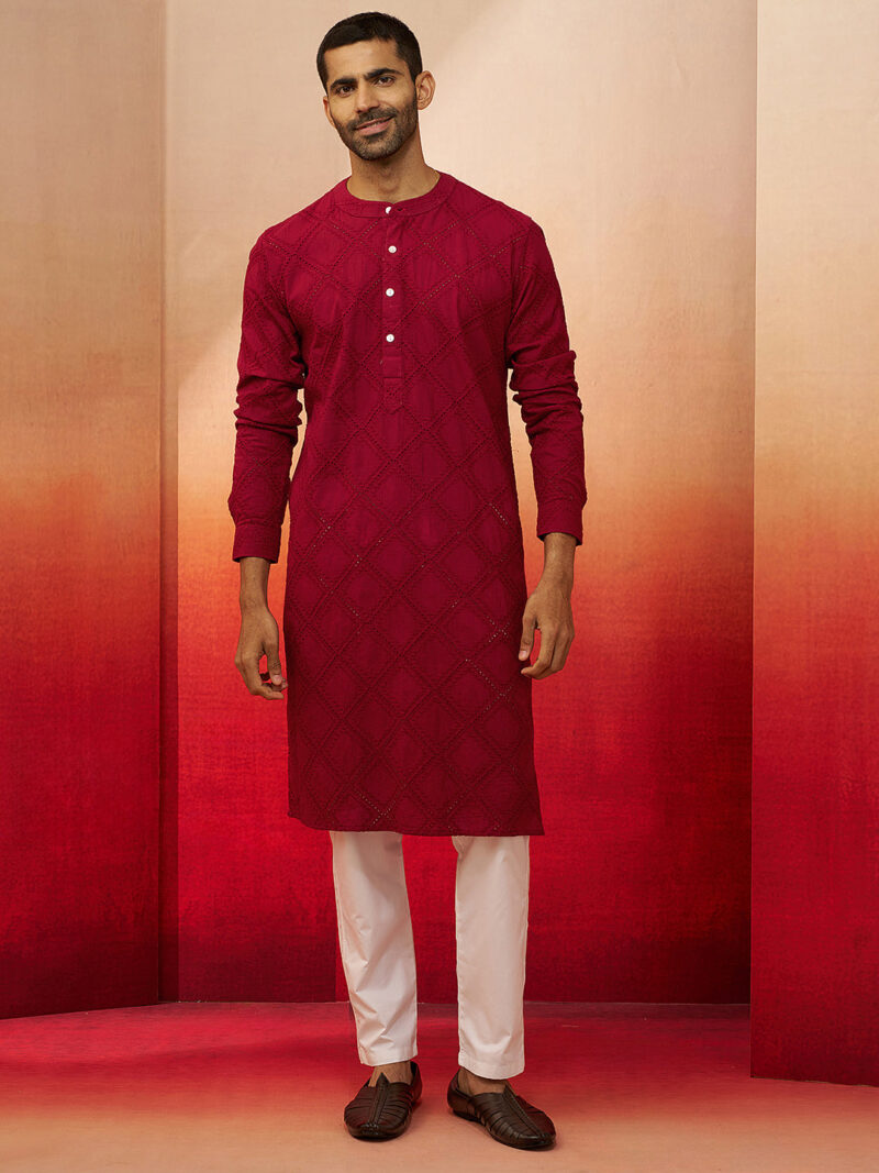 Stay comfortable in style with Absolutely Desi’s red cotton kurta featuring distinctive band collar and geometric thread embroidery all over. Front open design with elegant cuffed sleeves, knee-length with side slits and practical inseam pockets. Perfect for Navratri, summer casual wear, everyday occasions, and suitable for all regions.