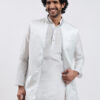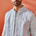 Silk Blend Jacquard Jacket long Nehru jacket, has a shawl collar, sleeveless,front open, a welt pocket. Material & Care Top: Silk Blend Dry Clean Sleeve Length – Sleeveless Top Shape – Straight Top Pattern – Self Design Top Design Styling – Straight Top Hemline – Straight Top Length – Waist Length Neck – Mandarin