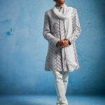 A beautifully handcrafted silk blend aqua color mirror work above knee length sherwani, has a mandarin collar, long sleeves, front invisible button with button placket, side slits.Comes with solid pant style pyjama,has a button closure and partially elasticated waistband.Wear it in parties,traditional functions and festive occasion. Material & Care Fabric: Silk Blend Dry Clean Sleeve Length – Full Sleeve Top Shape – Straight Top Hemline – Straight Top Length – Knee Length Neck Mandarin Collar Print or Pattern Type – Embroidered