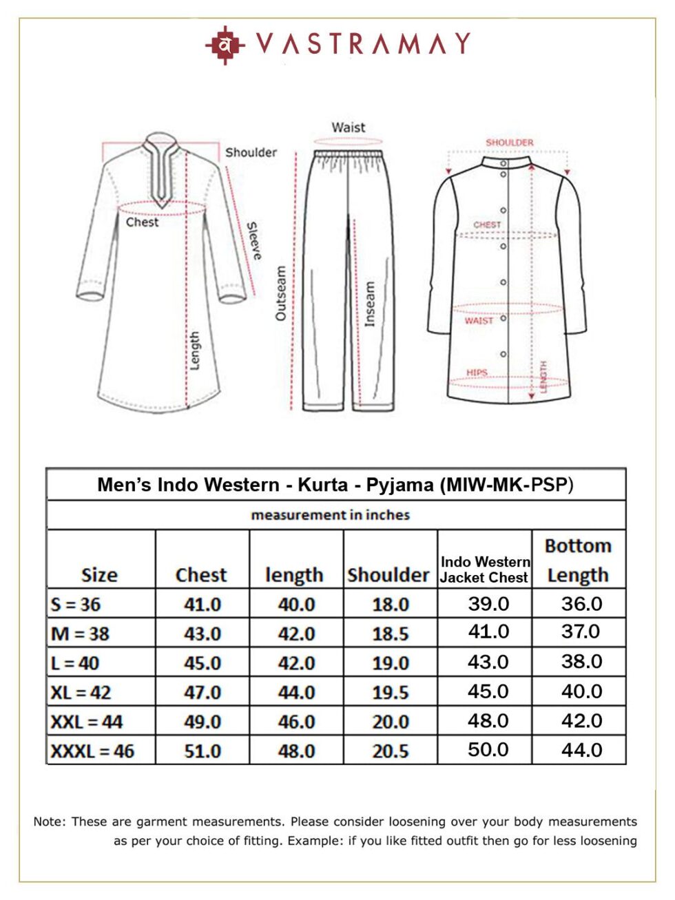 PRODUCT DETAILS Beige silk blend imported jacquard indo-Western sherwani, of classic regular length, has full sleeves, mandarin collar and button closure with cream viscose solid kurta has mandarin collar, full sleeves, knee length, and pockets with pyjama set.