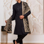 This black sequin-embroidered sherwani set with a matching pant and intricately designed dupatta is the epitome of regal sophistication and grandeur.sherwani Crafted with luxurious textured fabric adorned with subtle sequins, adding a refined shimmer.A tailored black straight-fit pant, complementing the sherwani’s elegance.A statement-making black velvet dupatta featuring heavy gold embroidery with intricate floral and paisley motifs.Perfect for weddings, festive celebrations, or evening cultural events.