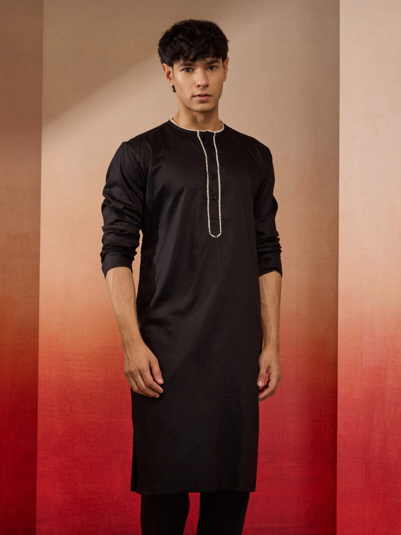 Men’s Black Cotton Millennium Kurta Lace Detail