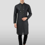 Add elegance to your ethnic wardrobe with Vastramay’s black embroidered kurta set. Features beautiful beads and mirror work with traditional floral motifs on premium silk blend, paired with comfortable black fine satin pyjama.