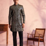 Black georgette Embellished Indo Western Set. Black color georgette Indo has embroidery with zig zag pattern sequins, stand collar, front open, welt pockets, full sleeves, knee length and comes with Black solid pant has an elasticated waist band and button closure. Material & Care Top: Georgette Bottom: Viscose Dry Clean Size & Fit The model (height 6′) is wearing a size L Sleeve Length – Long Sleeves Top Shape – Straight Top Type – Sherwani Top Pattern – Embellished Top Design Styling – Regular Top Hemline – Straight Top Length – Knee Length Neck – Mandarin Collar Print or Pattern Type – Embellished Bottom Pattern- Solid Waistband- Elasticated Complete The Look Sport this classic kurta set from VASTRAMAY this season. Dress this piece up with your favorite accessories and head out to any family event in style.