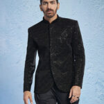 Velvet Sequined Embroidered slim-fit jodhpuri, has a mandarin collar, long sleeves, a full button placket,Straight hem and one welt pocket.Wear it in parties,traditional functions and festive occasion. Material & Care Fabric: Velvet Dry Clean Sleeve Length – Full Sleeve Top Shape – Straight Top Hemline – Straight Top Length – Waist Length Neck Mandarin Collar Print or Pattern Type – Embroidered