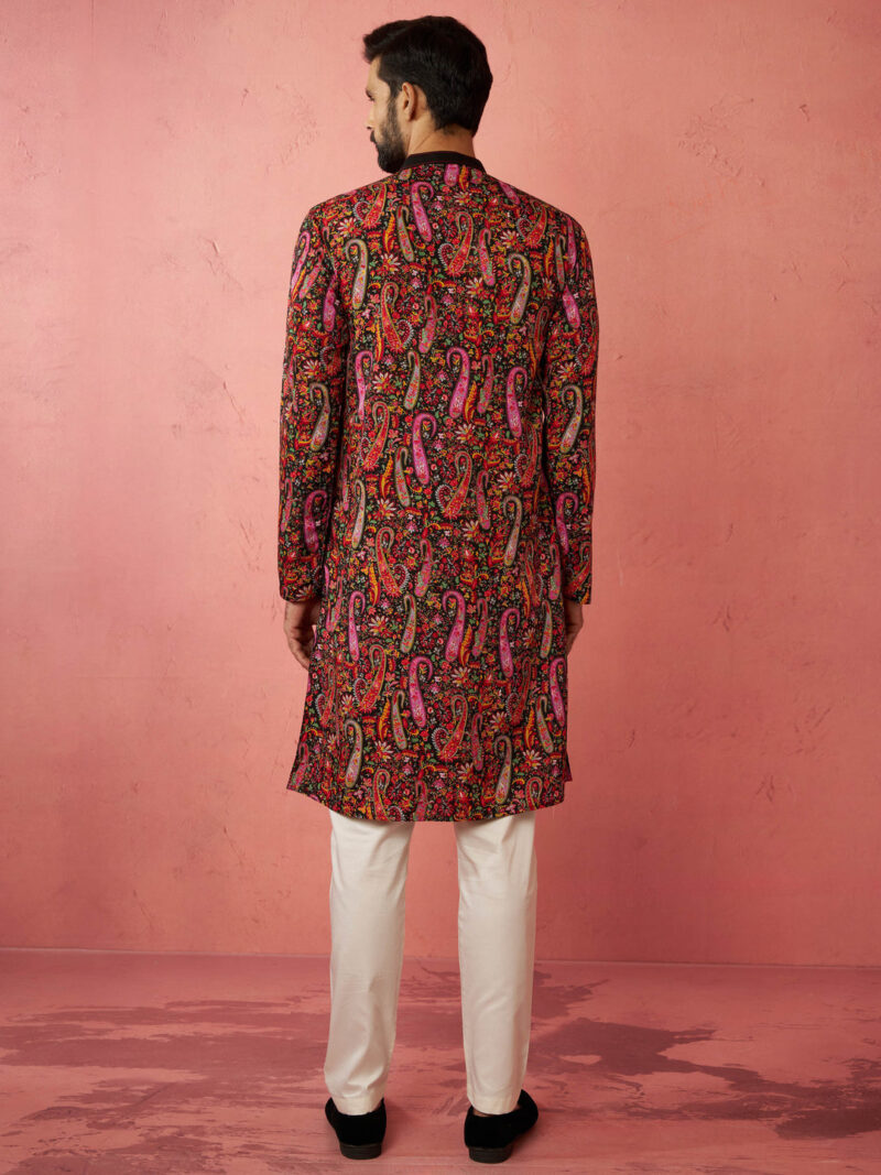Add elegance to your ethnic wardrobe with Vastramay’s black long kurta. Features beautiful digital print with traditional paisley motifs on premium viscose blend, paired with comfortable cream fine satin pyjama.