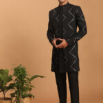 Black Zig Zag Mirror Work Indo Wester Sherwani Set. Sherwani Design Black color mirror work zig zag pattern Indo-western top has mandarin collar, full sleeves, button placket, straight hem with straight shape and pockets and black color pant style pyjama has an elasticated waistband and button closure. Material & Care Viscose Dry Clean Size & Fit The model (height 6′) is wearing a size L Sleeve Length – Long Sleeves Top Shape – Straight Top Hemline – Straight Top Length – Above Knee Length Neck Mandarin Collar Print or Pattern Type -Ornamented, Embroidered Bottom Closure- Button Waistband- Elasticated Bottom pattern -Solid Complete The Look Elegant and trendy, this sherwani from AbsolutelyDesi is a great add-on to your ethnic collection. Team it with a pair of semiformal shoes or Kolhapuris to get the complete look.