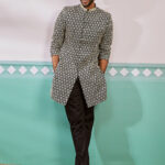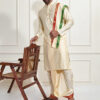 PRODUCT DETAILSThis men’s embroidered Indo-Western, pant set is a perfect fusion of tradition and modern elegance. intricate gold embroidery in a geometric pattern.A structured yet relaxed fit with a straight-cut silhouette.Gold-trimmed placket enhances the sophisticated design.Side slits ensure comfort and ease of movement.comes with slim-fit trousers complement the kurta.Perfect for Eid,weddings, receptions, and festive celebrations.