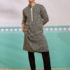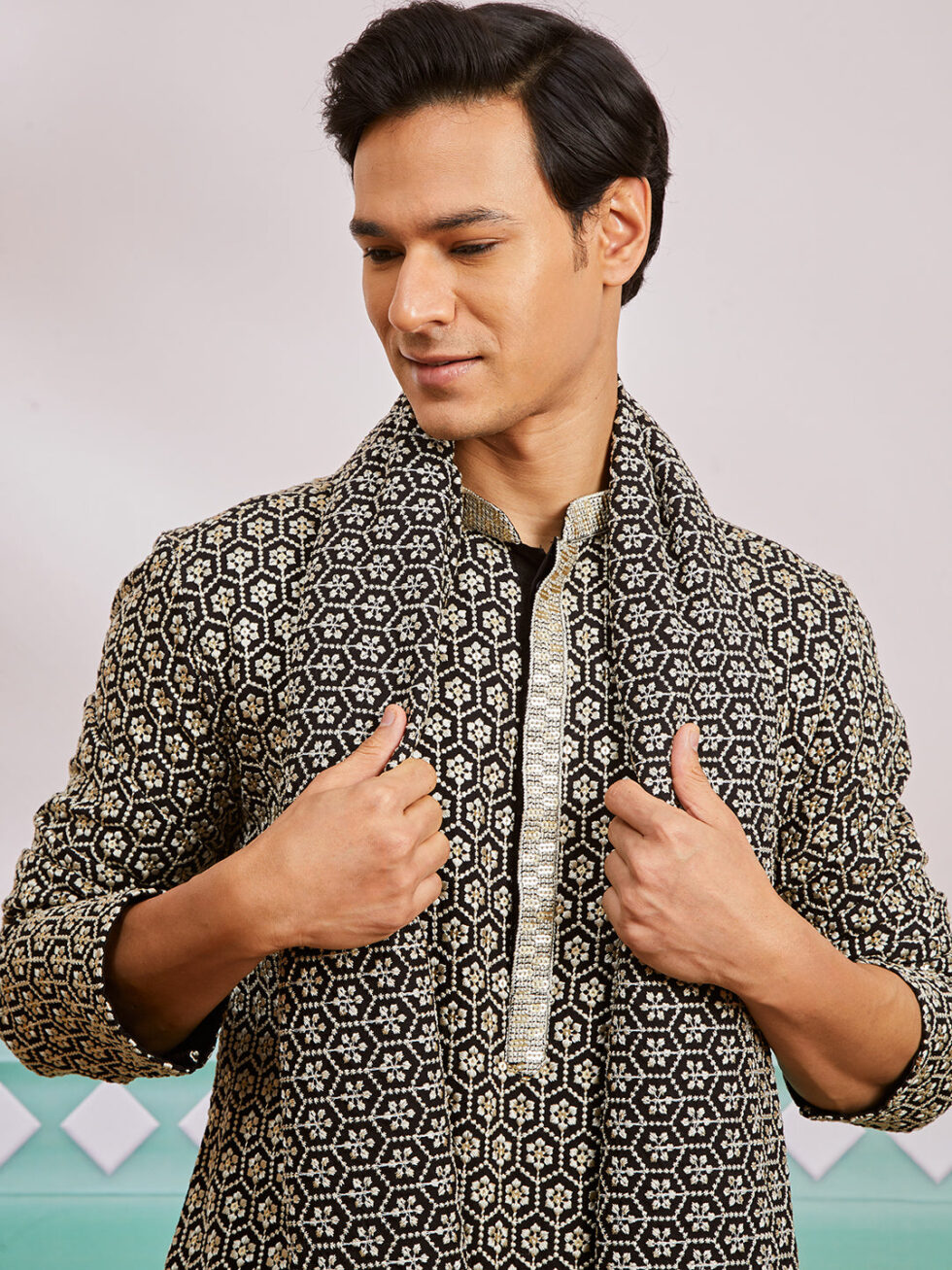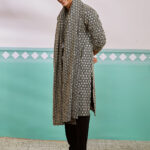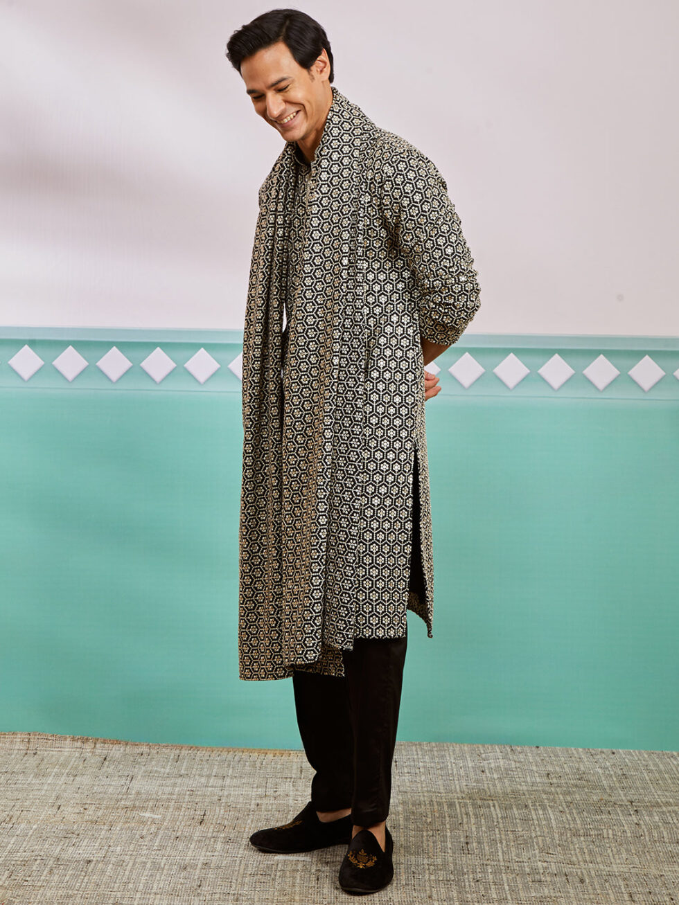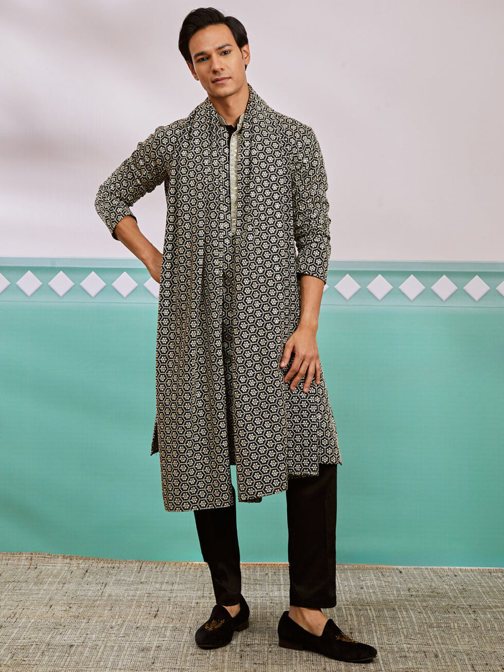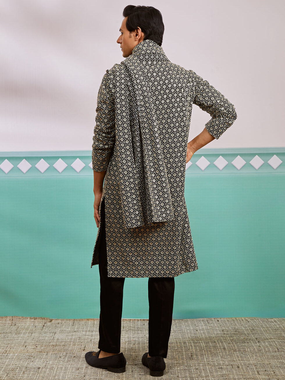 PRODUCT DETAILSThis men’s embroidered kurta, pant, and dupatta set blends traditional craftsmanship with contemporary elegance.The kurta features an all-over geometric pattern, giving it a regal and festive appeal. A contrasting gold-trimmed placket enhances the neckline, adding a refined touch. The long sleeves and straight-cut silhouette provide a classic yet modern fit.Paired with straight-cut pants, the outfit maintains a balanced and graceful look. The lightweight dupatta, adorned with the same intricate pattern as the kurta, drapes effortlessly, enhancing the ensemble’s traditional charm. The outfit is completed with embroidered loafers, making it a perfect choice for weddings, festive occasions, or cultural celebrations.