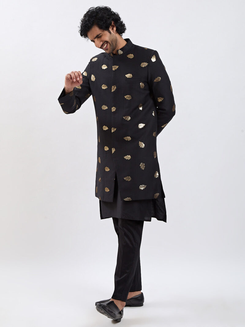 Silk Blend Sequence embellished motif work above knee length regular sherwani, has a mandarin collar, invisible button placket, long sleeves, with Solid viscose kurta, Knee length kurta has a mandarin collar, long sleeves, button placket, straight hem and silde slits.Comes with a black solid pant style Pyjama. Material & Care Fabric: Viscose Dry Clean Sleeve Length – Full Sleeves Top Shape – Straight Top Hemline – Straight Top Length – Knee Length Neck Mandarin Collar Print or Pattern Type – Ethnic Motifs Complete The Look Vastramay brings to you this stylish yet comfortable Sherwani Set. Adorn it for a perfect Classy & Trendy look. Pair it with a juti or a mojari for the Royal look.