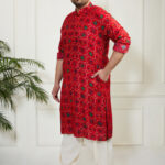 Gold foil printed patola design kurta, has mandarin neckline, full sleeves, and knee length with relaxed fit. Comes with viscose cowl style dhoti