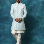 Blue silk blend imported jacquard indowestern sherwani, of classic regular length, has full sleeves, mandarin collar and button closure with cream kurta has mandarin collar, full sleeves, knee length and pockets with pyjama set. Material & Care Top Fabric: Silk Blend Dry clean Size & Fit The model (height 6′) is wearing a size L Sleeve Length – Long Sleeves Top Shape – Straight Top Hemline – Straight Top Length – Knee Length Neck Mandarin Collar Print or Pattern Type -Embroidered Complete The Look Elegant and trendy, this sherwani from VASTRAMAY is a great add-on to your ethnic collection. Team it with a pair of semiformal shoes or Kolhapuris to get the complete look.