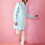 Make an impression with Vastramay’s blue jacquard indo-western set. Premium silk blend with ethnic motifs and luxurious satin lining, paired with comfortable cream cotton lycra trousers for grand celebrations.