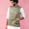 Enhance your ethnic wardrobe with Vastramay’s blue Lakhmini jacquard Nehru jacket featuring exquisite self-texture and geometric patterns. Premium imported fabric with luxurious satin lining.