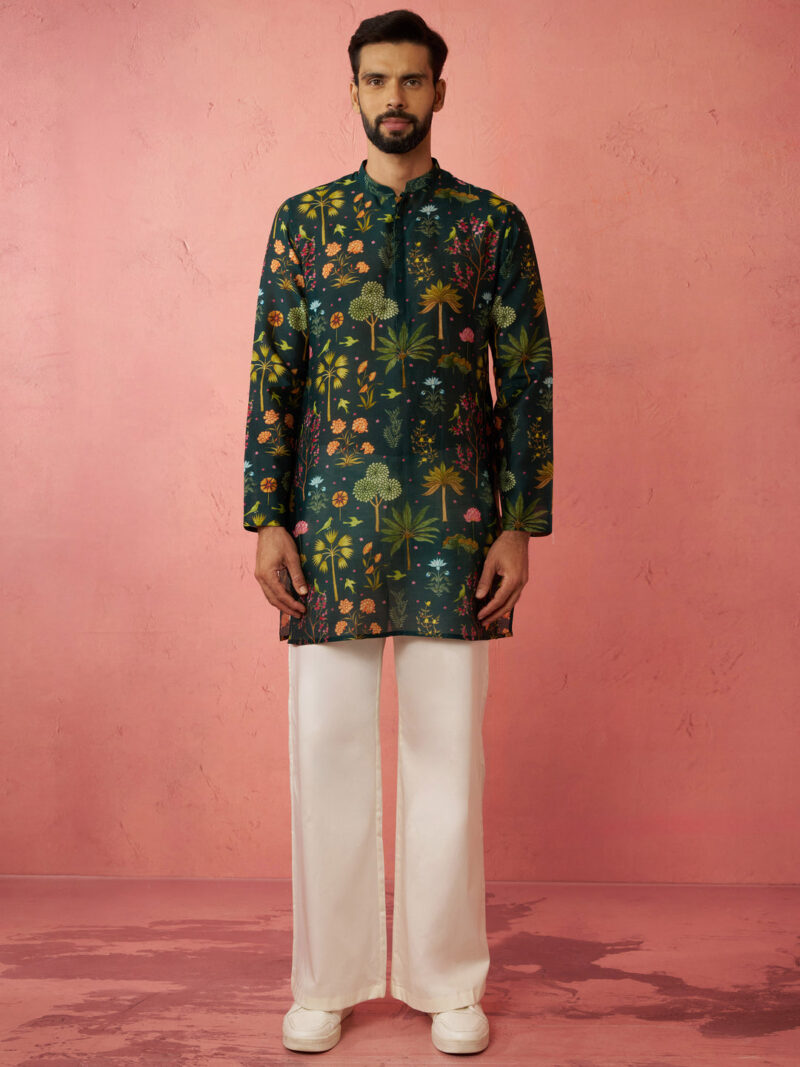 Men’s Bottle Green Digital Print Kurta with Cream Satin Palazzo Set