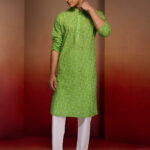 Experience freshness with Vastramay’s green bandhani printed kurta set. Premium cambric cotton with beautiful bandhani screen print, concealed design, and comfortable white pyjama for summer celebrations.