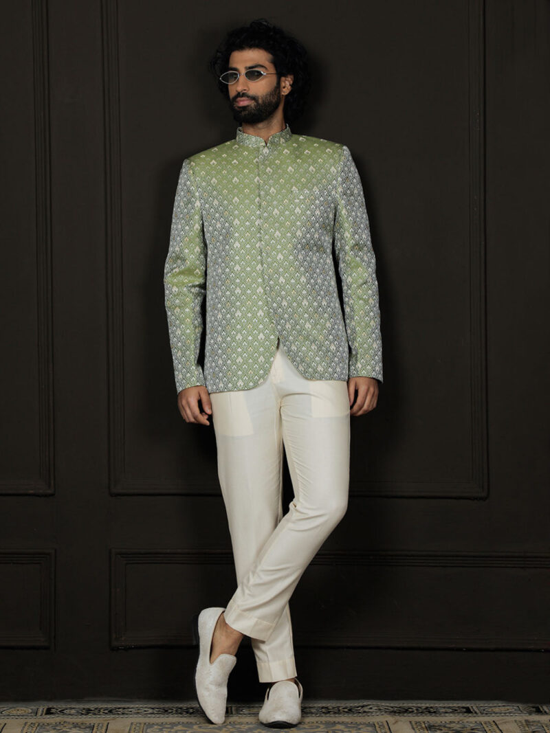 Silk Blend Jacquard slim-fit jodhpuri, has a mandarin collar, long sleeves, a full button placket, straight hem and four flap patch pockets. Material & Care Fabric: Silk Blend Dry Clean Sleeve Length – Full Sleeve Top Shape – Regular Top Hemline – Straight Top Length – Waist Length Neck Mandarin Collar Print or Pattern Type – Woven Design Complete The Look Absolutely Desi brings to you this stylish yet comfortable Sherwani Set. Adorn it for a perfect Classy & Trendy look. Pair it with a juti or a mojari for the Royal look.
