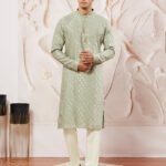 PRODUCT DETAILSSilk blend jaquard fabric, knee length kurta, has a mandrin embroidered work collar, long sleeves, button placket, straight hem and side slits. Comes with cream solid pant style pyjama, has a button closure and partially elasticated waistband.