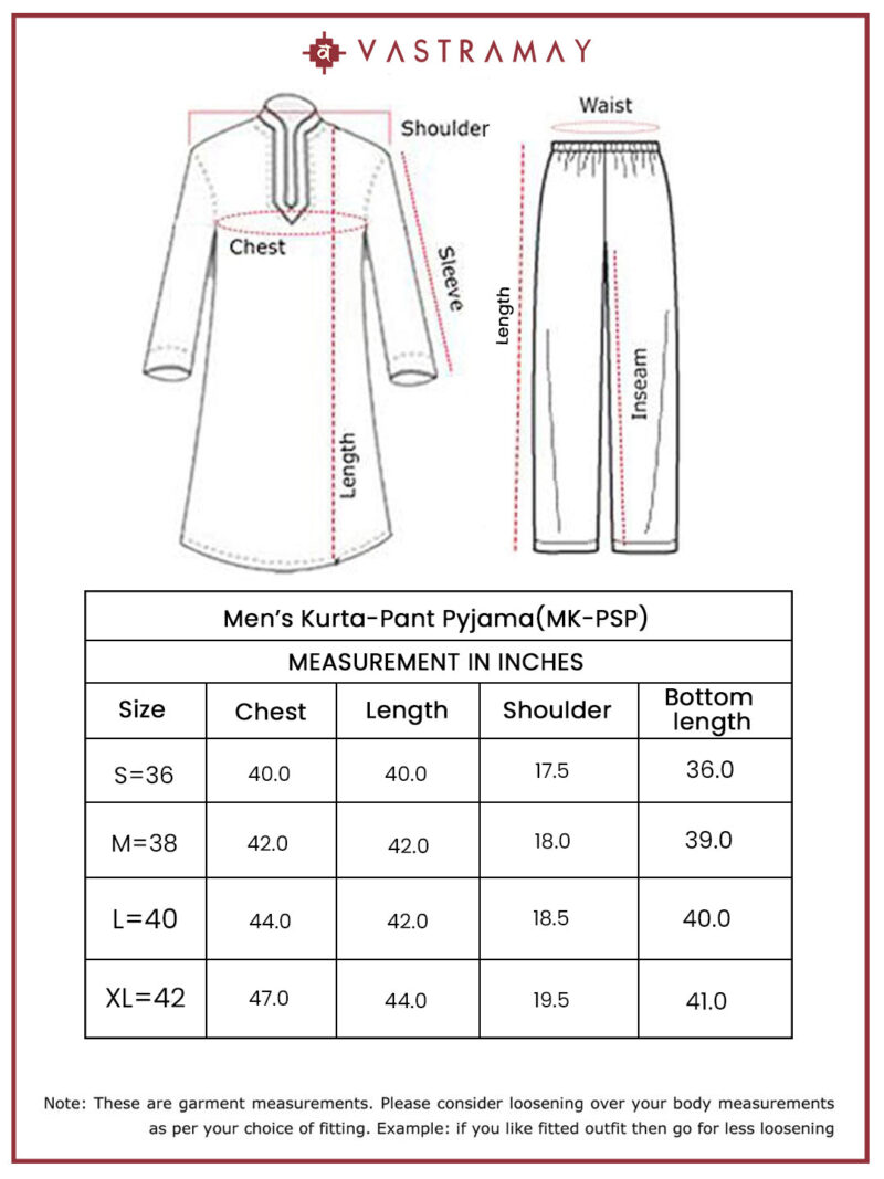 Material & CareTop Fabric: Silk Blend?Bottom Fabric: ViscoseDry CleanSize & FitThe model (height 6′) is wearing a size LSpecificationsSleeve Length – Full SleeveTop Shape – StraightTop Hemline -?StraightTop Length Knee LengthNeck ?Mandarin CollarPrint or Pattern Type -Self Design