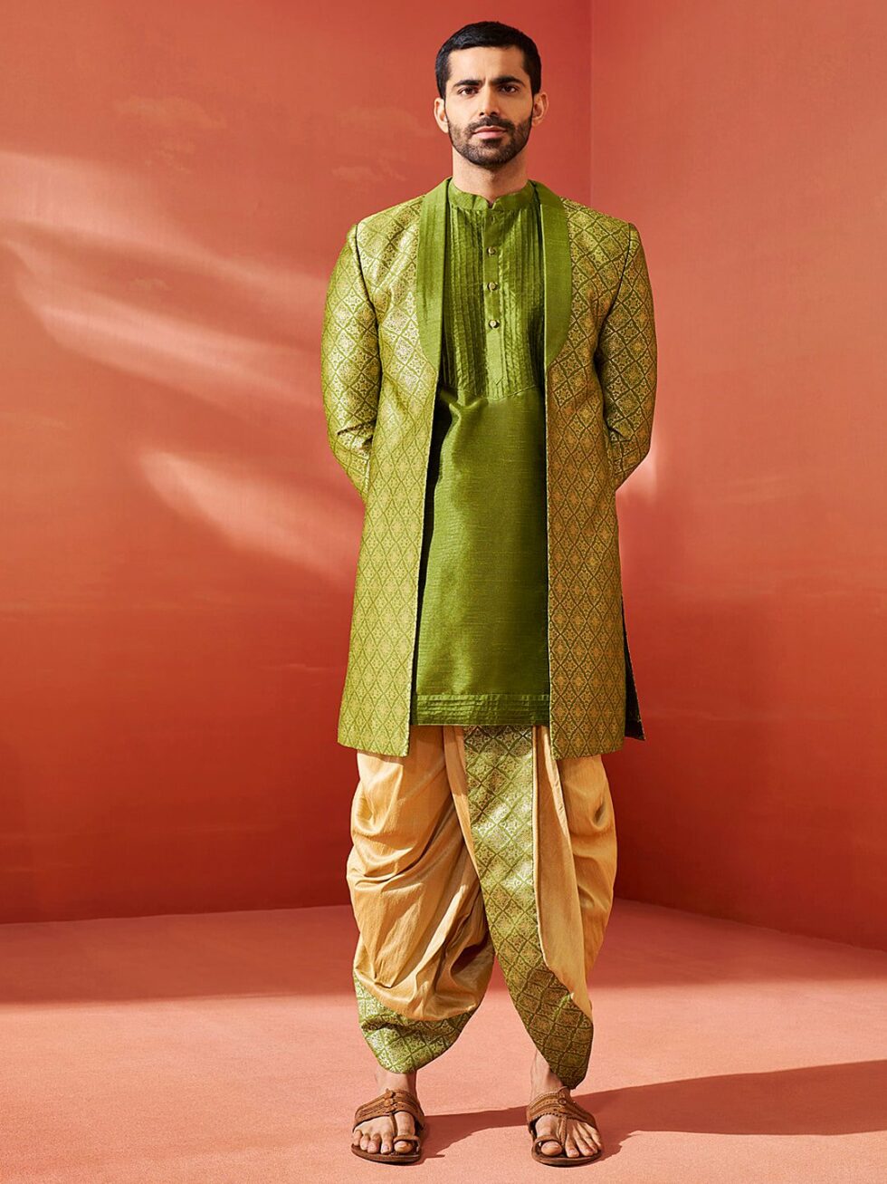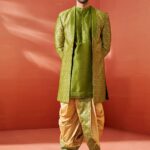 Silk Blend Jacquard knee length regular sherwani, has a shawl collar,front open, long sleeves with knee length kurta,has a mandrin collar, long sleeves,Button closure, straight hem and side slits,comes with silk blend dhoti pant for men’s mid-rise ready to wear dhoti in traditional pattern,Wear it in parties,traditional functions and festive occasion.