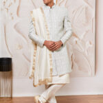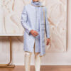 Silk blend imported jacquard indowestern sherwani, of classic regular length, has full sleeves, mandarin collar and button closure. Paired with a contrasting viscose comfortable kurta and pant style pyjama,The men’s dupatta is a graceful and elegant accessory, designed to add a refined touch to ethnic attire. The soft fabric exudes sophistication, while the delicate gold-bordered detailing enhances its regal appeal.perfect for weddings, festive occasions, and cultural events.