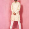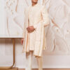 This men’s embroidered Indo-Western, pant, and dupatta set is a perfect fusion of tradition and modern elegance. intricate gold embroidery in a geometric pattern.A structured yet relaxed fit with a straight-cut silhouette.Gold-trimmed placket enhances the sophisticated design.Side slits ensure comfort and ease of movement.comes with slim-fit trousers complement the kurta.Matching embroidered dupatta adds a regal charm.Perfect for Eid,weddings, receptions, and festive celebrations. Material & Care Top: Rayon Dry Clean Sleeve Length – Long Sleeves Top Shape – Regular Top Pattern – Embroidered Top Design Styling – Straight Top Hemline – Straight Top Length – Knee Length Neck – Mandarin Collar Print or Pattern Type – Embroidered