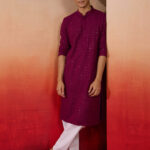 Men’s Purple Rayon Sequin Embroidered Kurta with White Trousers
