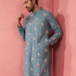 Enhance your festive collection with Vastramay’s sage green cotton muslin kurta. Features premium thread embroidery and sequin work with floral motifs on luxurious muslin fabric.