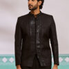 This men’s jodhpuri jacket modern elegance with a bold and artistic touch.The standout feature is the intricately embroidered jodhpuri jacket, showcasing a mesmerizing nature-inspired design with delicate trees, florals, and peacocks in earthy tones. The mandarin collar and minimal button detailing enhance its refined aesthetic. Styled with classic black woven-texture loafers, this ensemble is perfect for eid ,weddings, festive occasions, and evening events, blending tradition with contemporary fashion effortlessly.