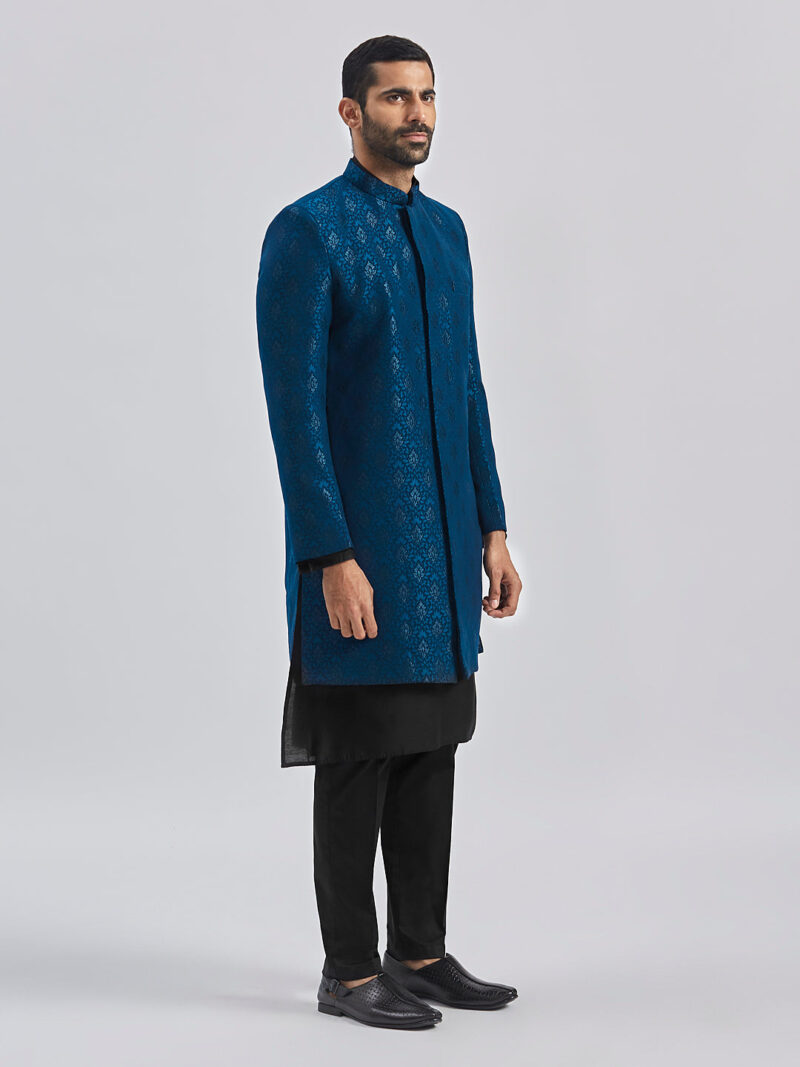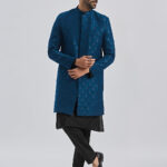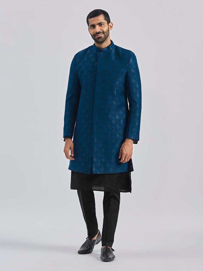Silk Blend Jacquard knee length regular sherwani, has a mandarin collar,front open, invisible button placket, long sleeves with Solid viscose kurta, Knee length kurta has a mandarin collar, long sleeves, button placket, straight hem and silde slits.Comes with pant style pyjama, has a waistband with partially elasticated, button closure, side pockets. Material & Care Fabric: Viscose Dry Clean Sleeve Length – Full Sleeves Top Shape – Regular Top Hemline – Straight Top Length – Knee Length Neck Mandarin Collar Print or Pattern Type – Self Design Complete The Look Vastramay brings to you this stylish yet comfortable Sherwani Set. Adorn it for a perfect Classy & Trendy look. Pair it with a juti or a mojari for the Royal look.