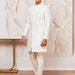 This men’s sherwani, pant set is a sophisticated and regal ensemble, perfect for weddings and grand celebrations. The sherwani features a with intricate gold jacquard motifs, exuding elegance and royal charm. The structured silhouette enhances the wearer’s posture, while the mandarin collar and front button detailing add a refined touch. Paired with tailored cream-colored pants, the outfit maintains a balanced and polished look. The matching jacquard dupatta, adorned with a delicate gold border, drapes gracefully to complete the ensemble. Styled with traditional embroidered juttis, this set is ideal for grooms, groomsmen, or anyone looking to make a striking impression at special occasions.