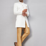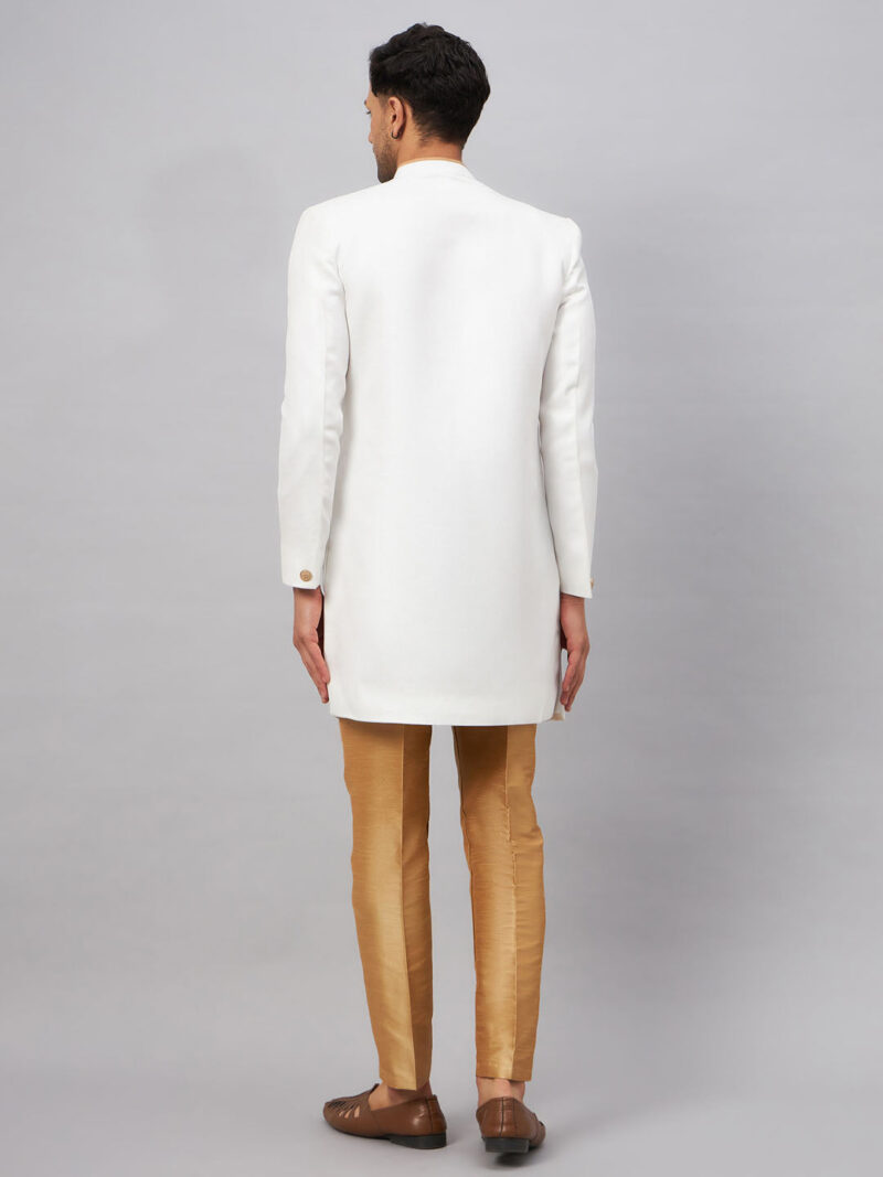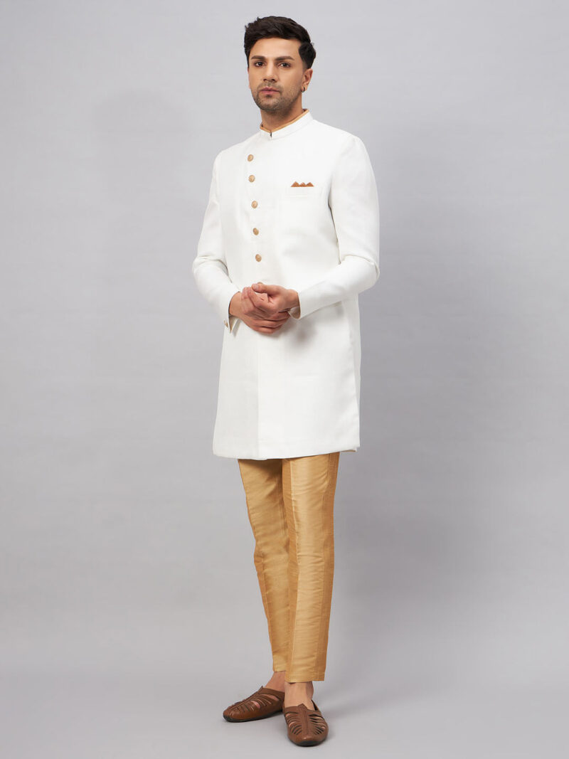 White Solid Sherwani With rose gold Solid Pant style pyjama set. White Sleek and Smart Looking Angrakha Style Indo-Western Sherwani With rose gold pant style pyjama has an elasticated waistband. Material & Care Top Fabric: Jute Cotton Bottom Fabric: Cotton Blend Dry clean Size & Fit The model (height 6′) is wearing a size L Sleeve Length – Long Sleeves Top Shape – Straight Top Hemline – Straight Top Length – Above Knee Length Neck Mandarin Collar Print or Pattern Type – Self Design Bottom Pattern – Solid Bottom Closure – Slip-On Waistband Elasticated Complete The Look Elegant and trendy, this sherwani from VASTRAMAY is a great add-on to your ethnic collection. Team it with a pair of semiformal shoes or Kolhapuris to get the complete look.