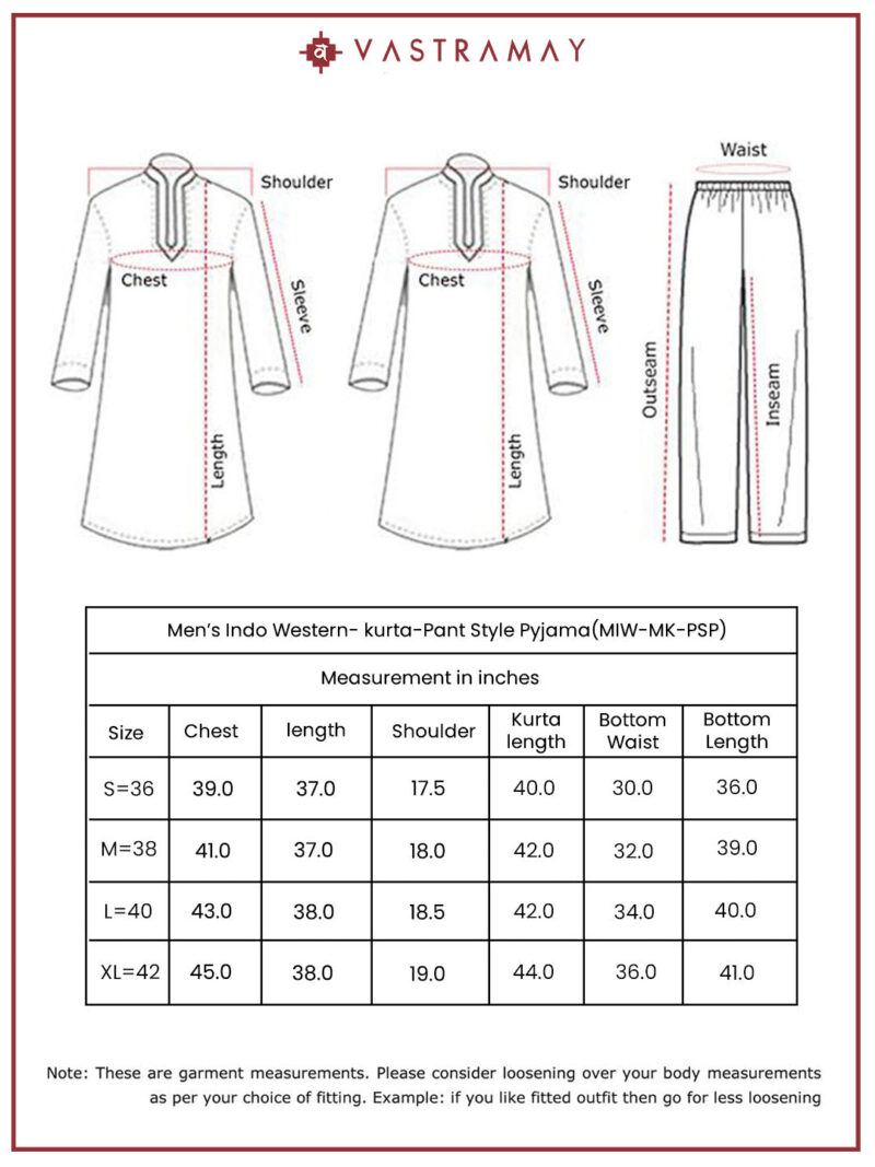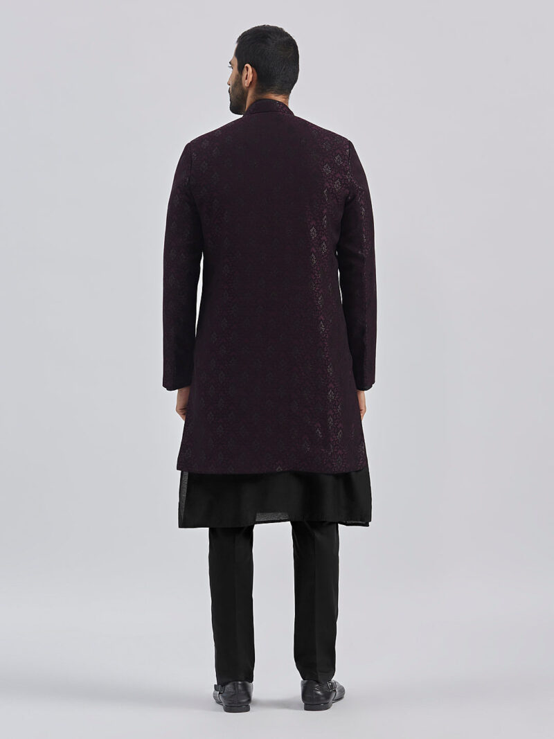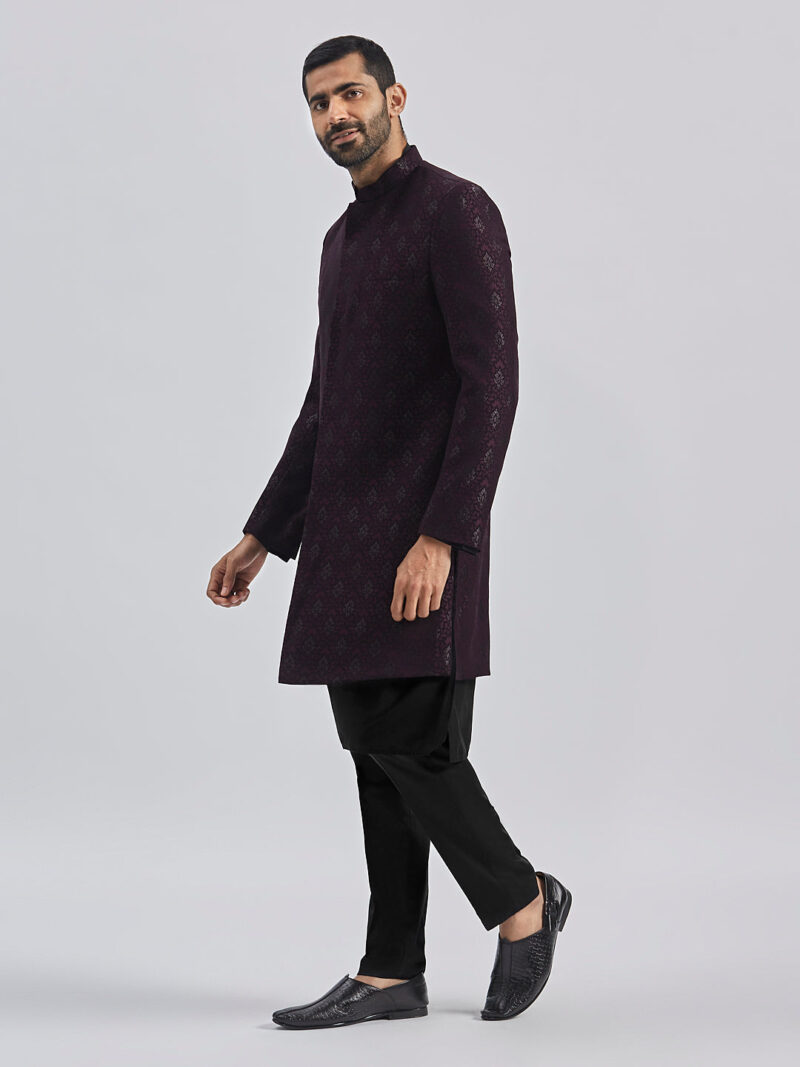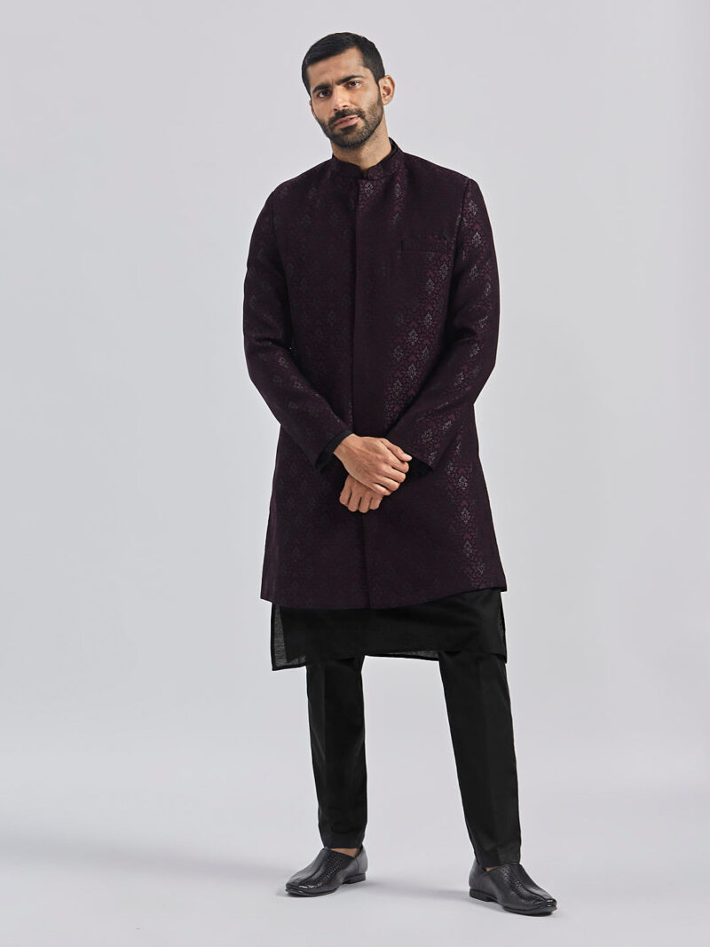 Silk Blend Jacquard knee length regular sherwani, has a mandarin collar,front open, invisible button placket, long sleeves with Solid viscose kurta, Knee length kurta has a mandarin collar, long sleeves, button placket, straight hem and silde slits.Comes with pant style pyjama, has a waistband with partially elasticated, button closure, side pockets. Material & Care Fabric: Viscose Dry Clean Sleeve Length – Full Sleeves Top Shape – Regular Top Hemline – Straight Top Length – Knee Length Neck Mandarin Collar Print or Pattern Type – Self Design Complete The Look Vastramay brings to you this stylish yet comfortable Sherwani Set. Adorn it for a perfect Classy & Trendy look. Pair it with a juti or a mojari for the Royal look.