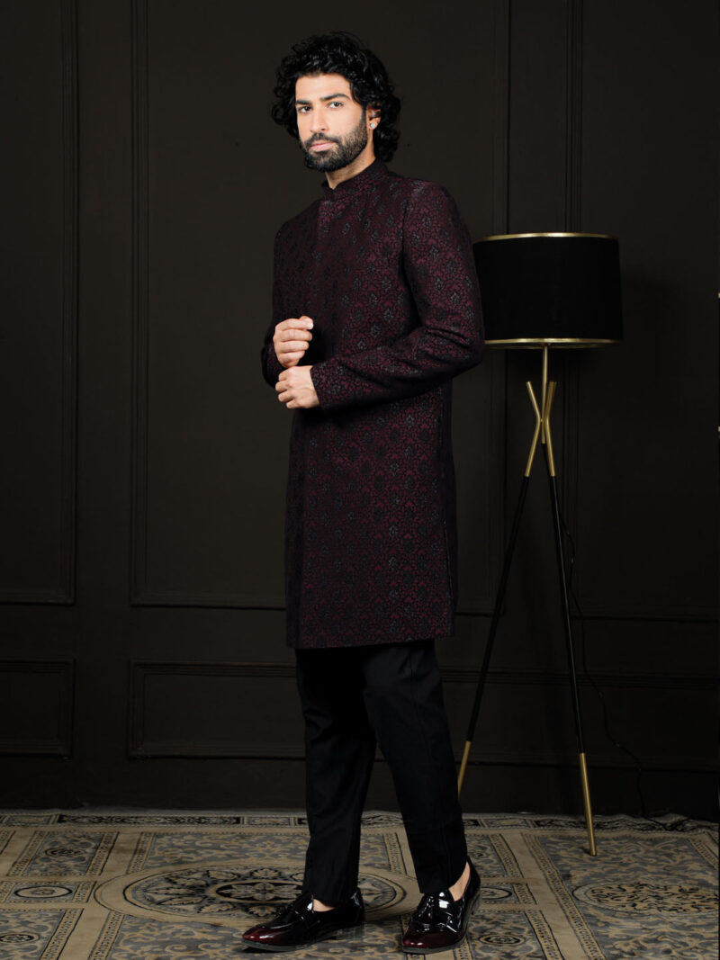 Silk Blend Jacquard knee length regular sherwani, has a mandarin collar,front open, invisible button placket, long sleeves.Comes with pant style pyjama, has a waistband with partially elasticated, button closure, side pockets. Material & Care Fabric: Silk Blend Dry Clean Sleeve Length – Full Sleeves Top Shape – Regular Top Hemline – Straight Top Length – Knee Length Neck Mandarin Collar Print or Pattern Type – Sequince Complete The Look Vastramay brings to you this stylish yet comfortable Sherwani Set. Adorn it for a perfect Classy & Trendy look. Pair it with a juti or a mojari for the Royal look.