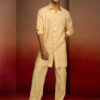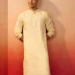 Brighten your festive celebrations with Vastramay’s yellow embroidered silk kurta. Features thread embroidery with sequin work, perfect for Diwali and wedding occasions.