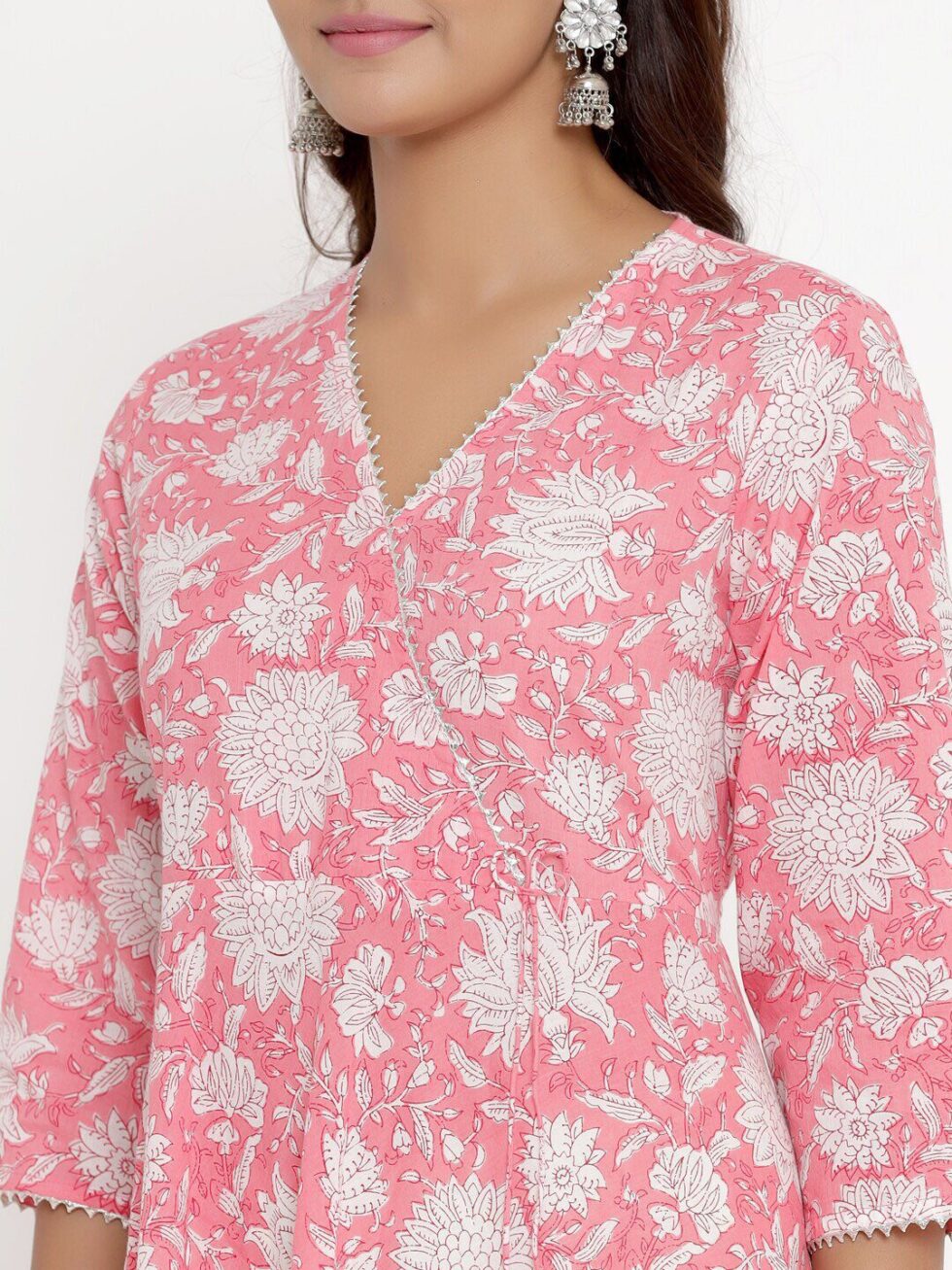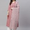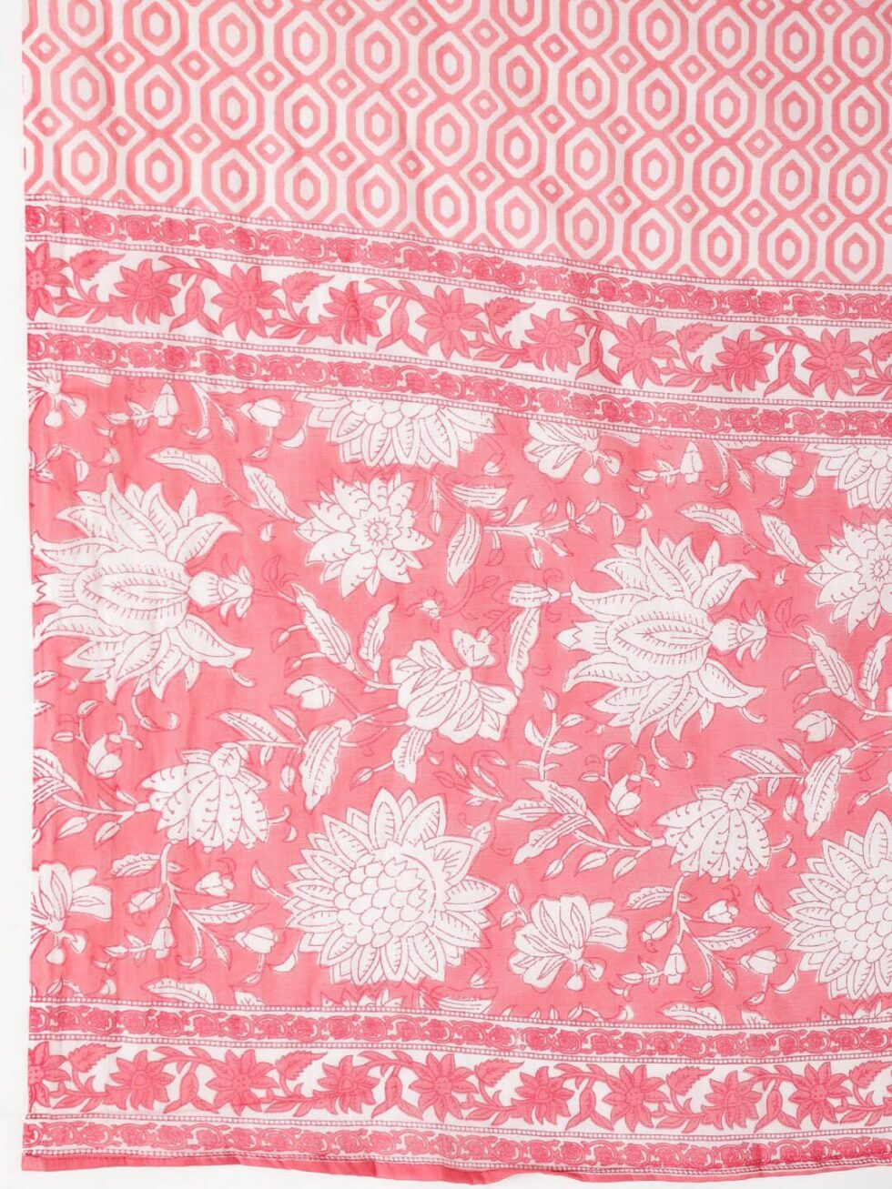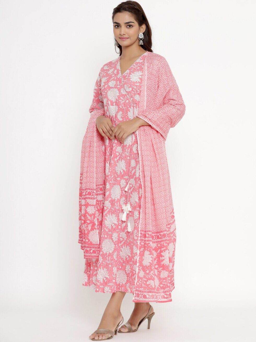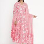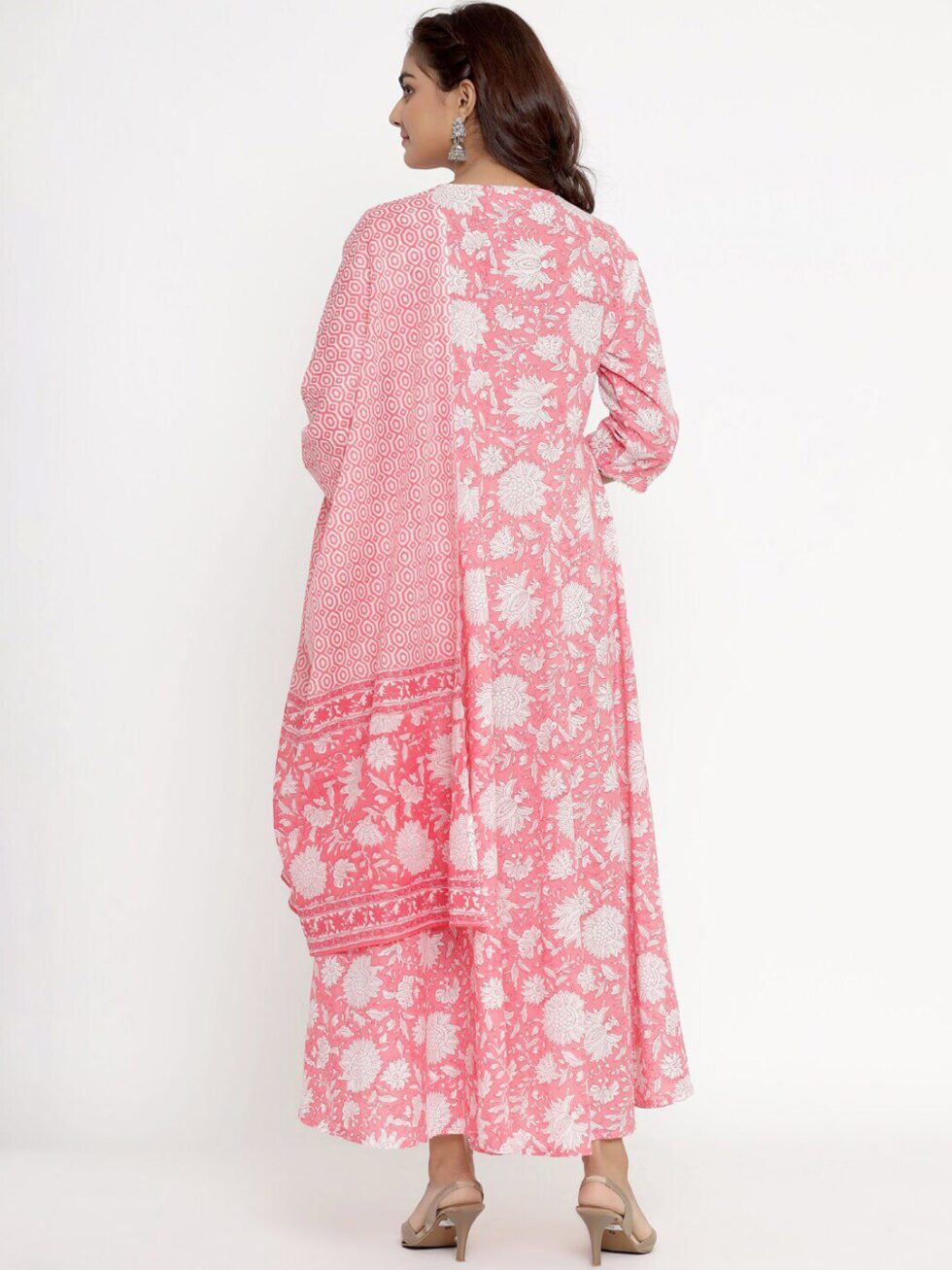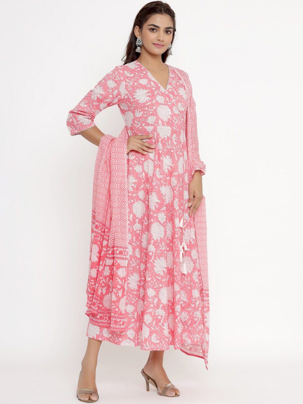 MIRAVAN Women Pink & White Floral Printed Cotton Anarkali Kurta With Dupatta