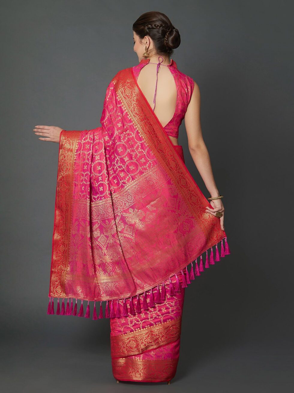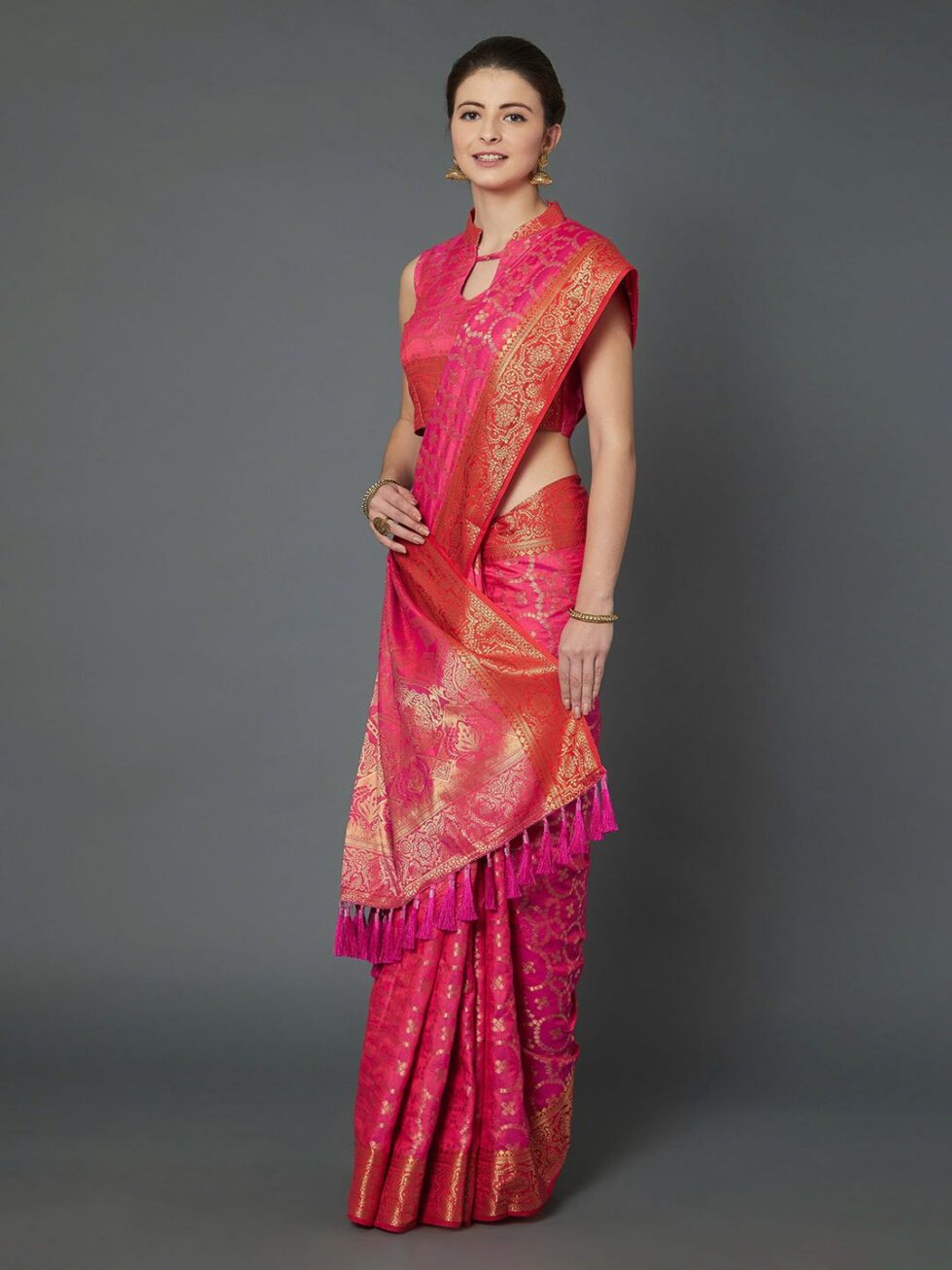 Design Detail: Pink banarasi woven design saree, has a woven design border Blouse Piece The model is wearing a blouse from our stylists collection, see the image for a mock-up of what the actual blouse would look like
