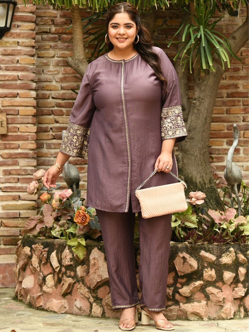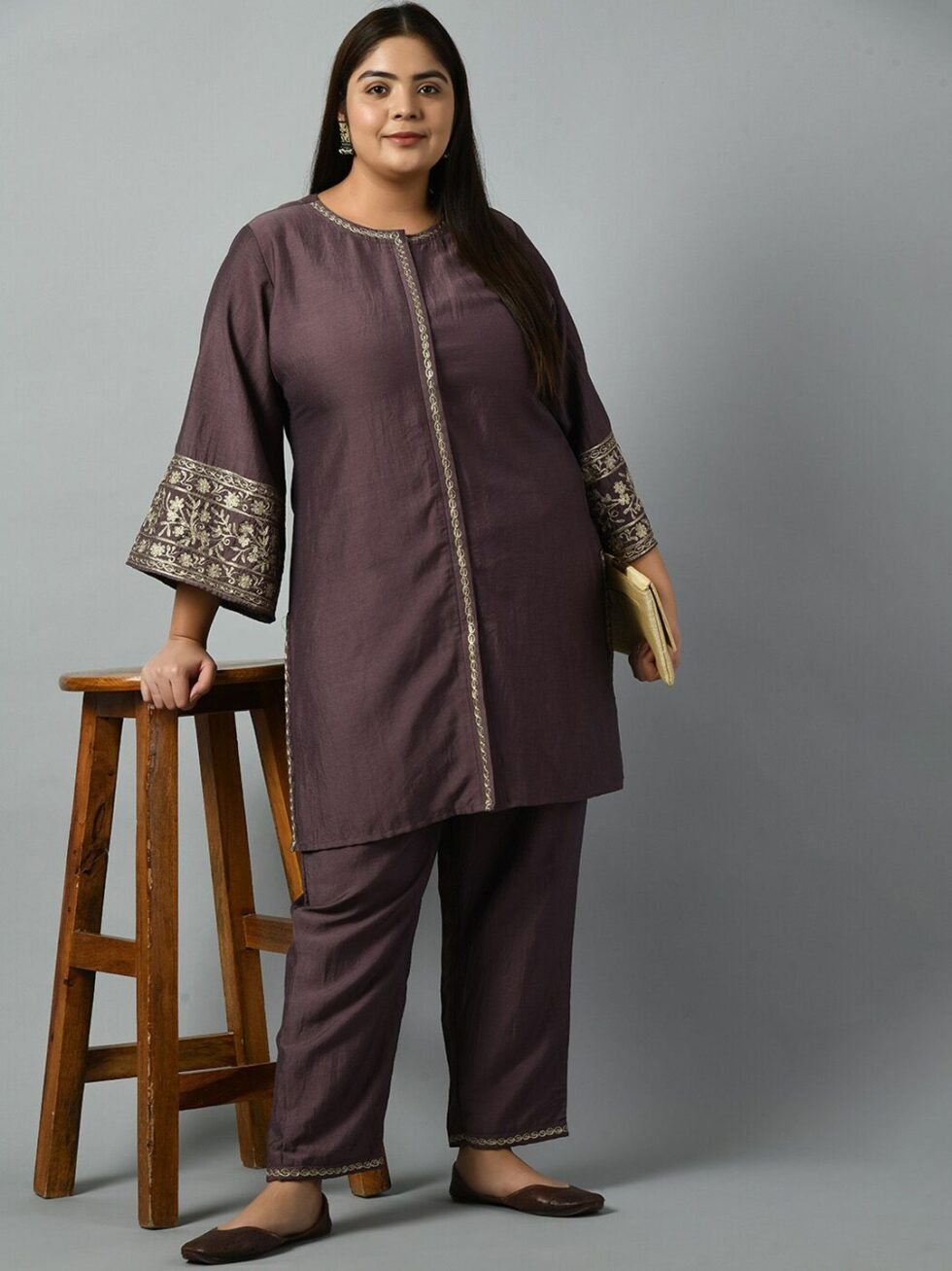 PrettyPlus by Desinoor.com Plus Size Floral Embroidered Flared Sleeves Kurta with Palazzos
