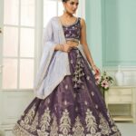 ?Lehenga:- Made of premium quality Purple Tissue fabric Full Flaire Semi-Stitched Lehenga With Moti, Sequinse and Coding work has a thread Embroidery work. Has a thread work border on the hemline.