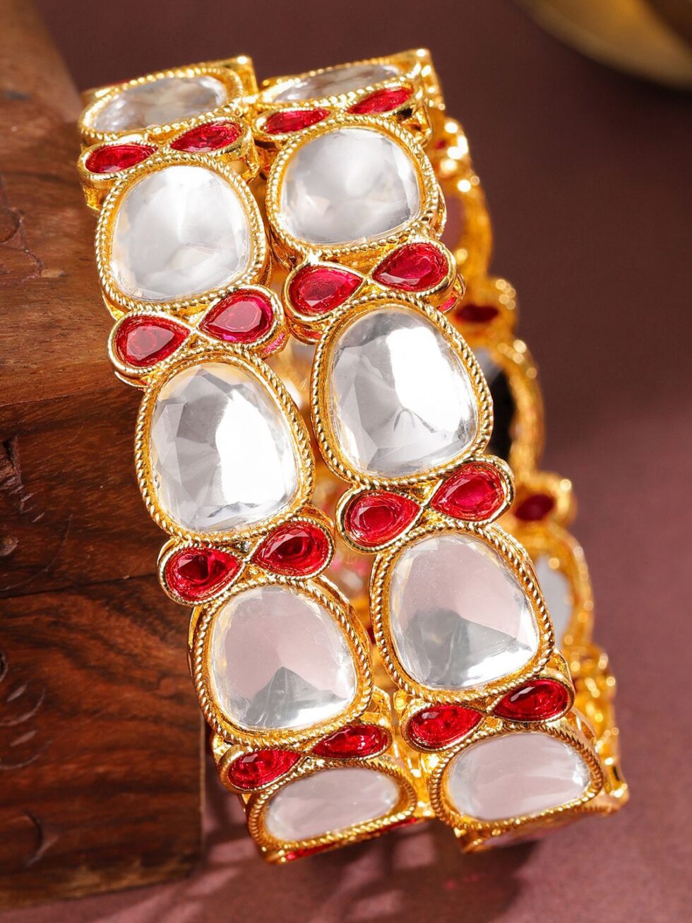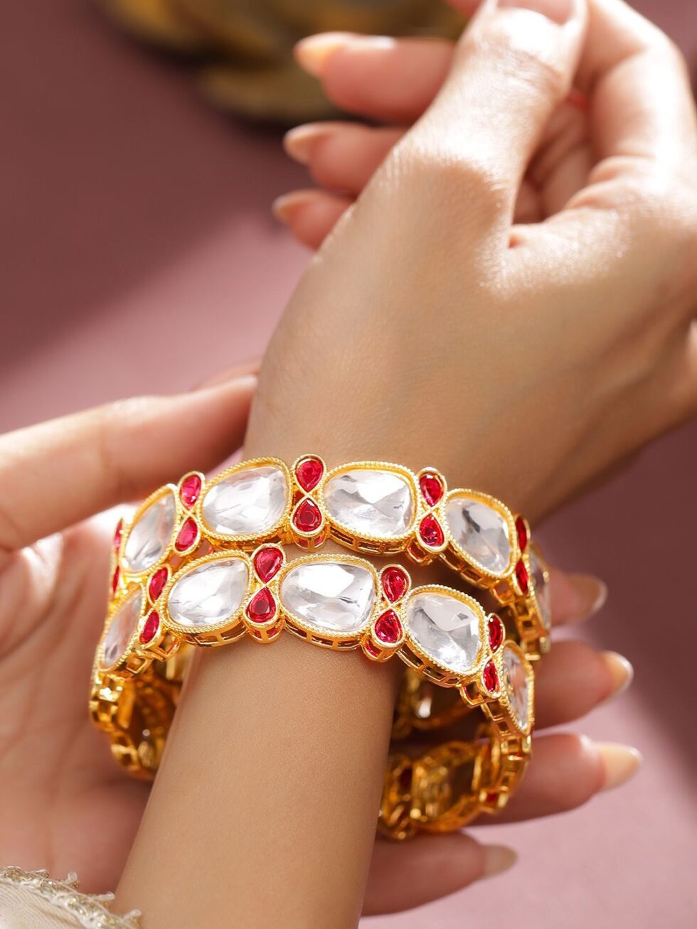 Set of two 18k gold-plated bangles, each has white cubic zirconia and red ruby stone-studded details, secured with slip-on closure
