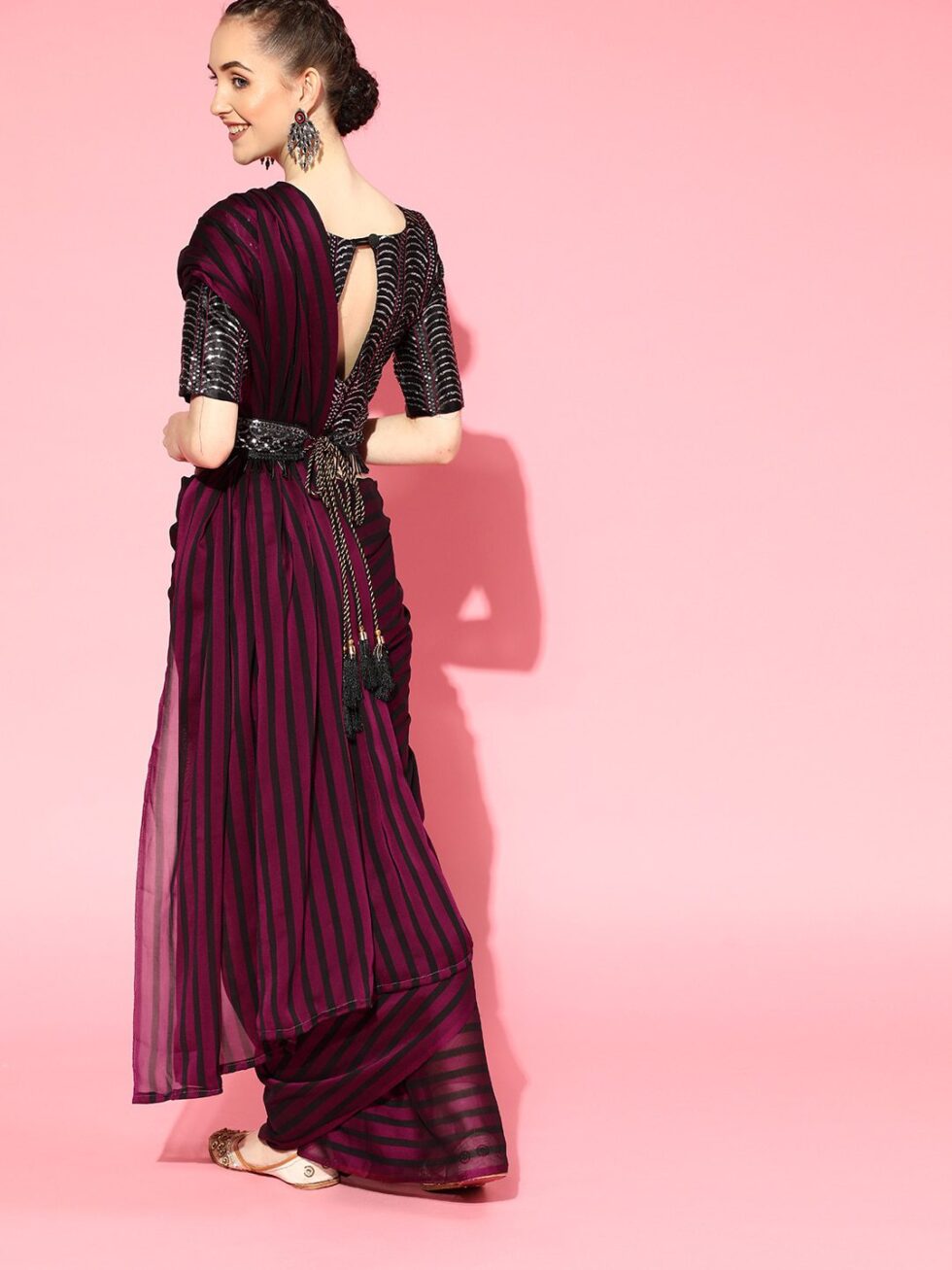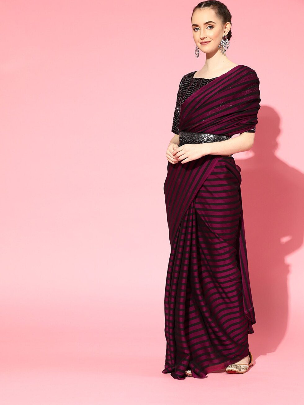 Saree mall Burgundy Striped Poly Georgette Party Wear Saree with Matching Blouse